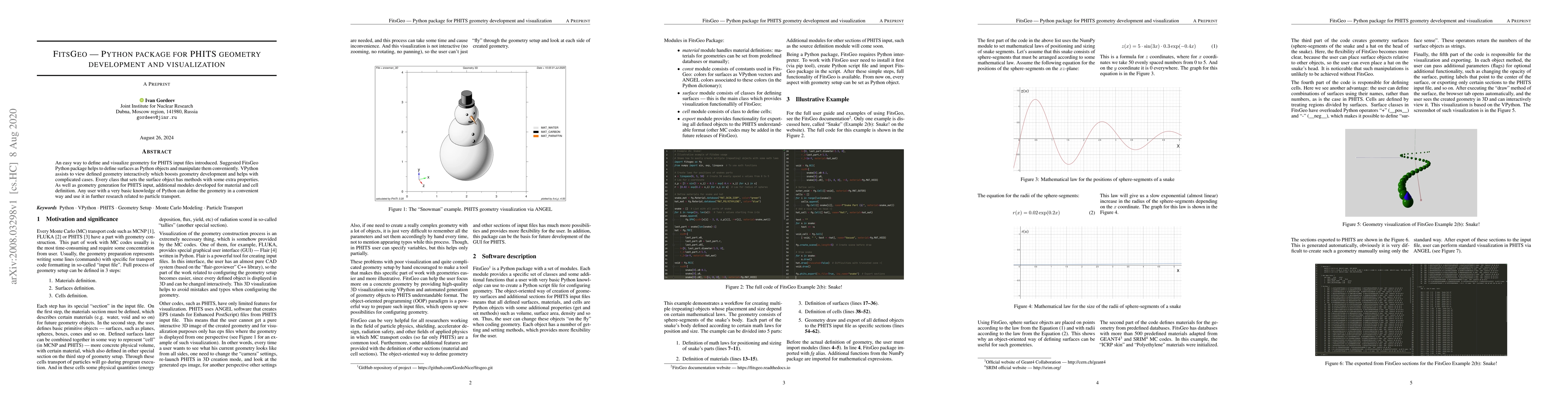 FitsGeo is a Python package designed to simplify the definition and visualization of geometry for PHITS simulations, utilizing VPython for interactive viewing. It enables users with basic Python knowledge to create and manage complex geometries, materials, and cells for particle transport research.