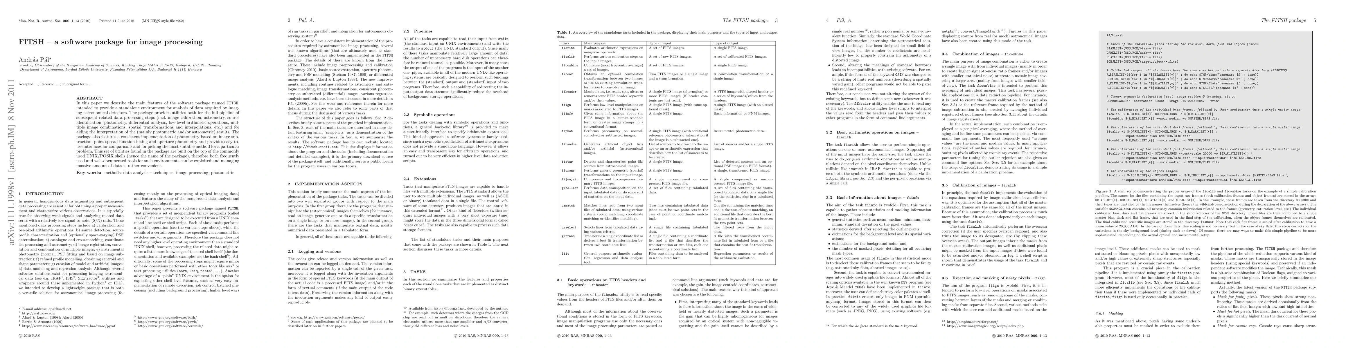 A software package called FITSH is introduced for image processing in astronomy, providing a comprehensive set of tools for data analysis and interpretation. The package offers easy-to-use interfaces and a consistent implementation of photometry methods.