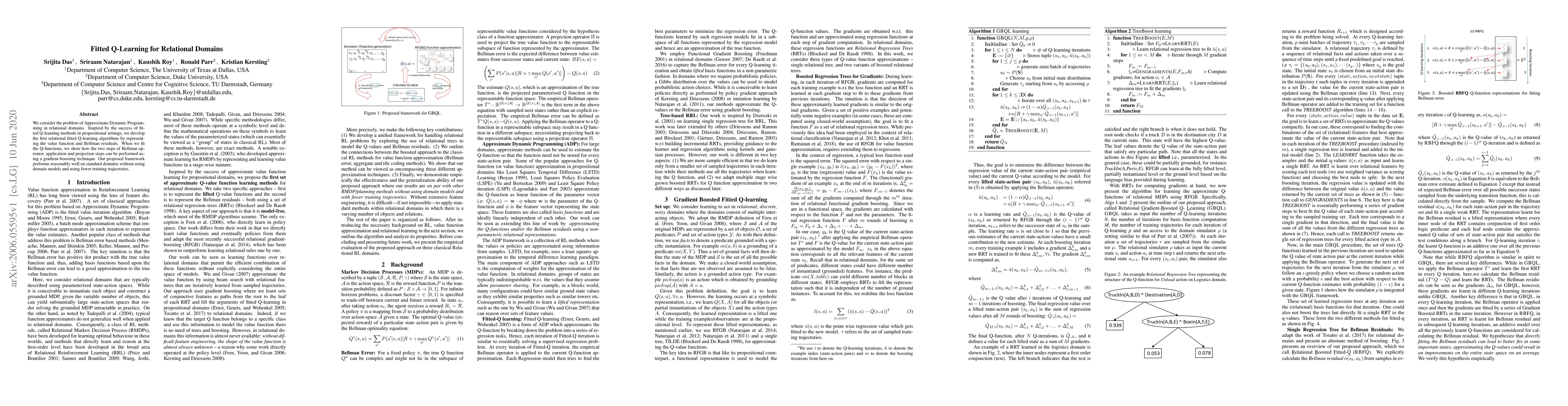 Fitted Q-learning algorithms are extended to relational domains, employing gradient-boosting for the Bellman operator's application and projection steps. The proposed framework shows competitive performance on standard relational domains with fewer training trajectories.