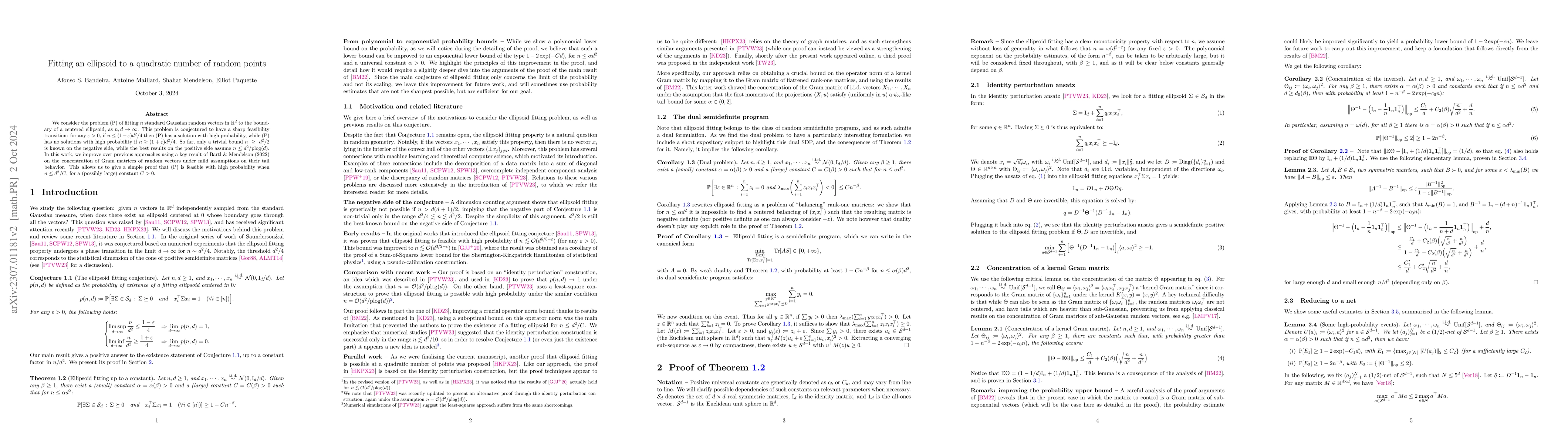 This paper addresses the problem of fitting an ellipsoid to a quadratic number of random points in high dimensions, proving that the problem is feasible with high probability when the number of points is sufficiently less than $d^2$, improving on previous bounds. The authors leverage a result on the concentration of Gram matrices to achieve this.
