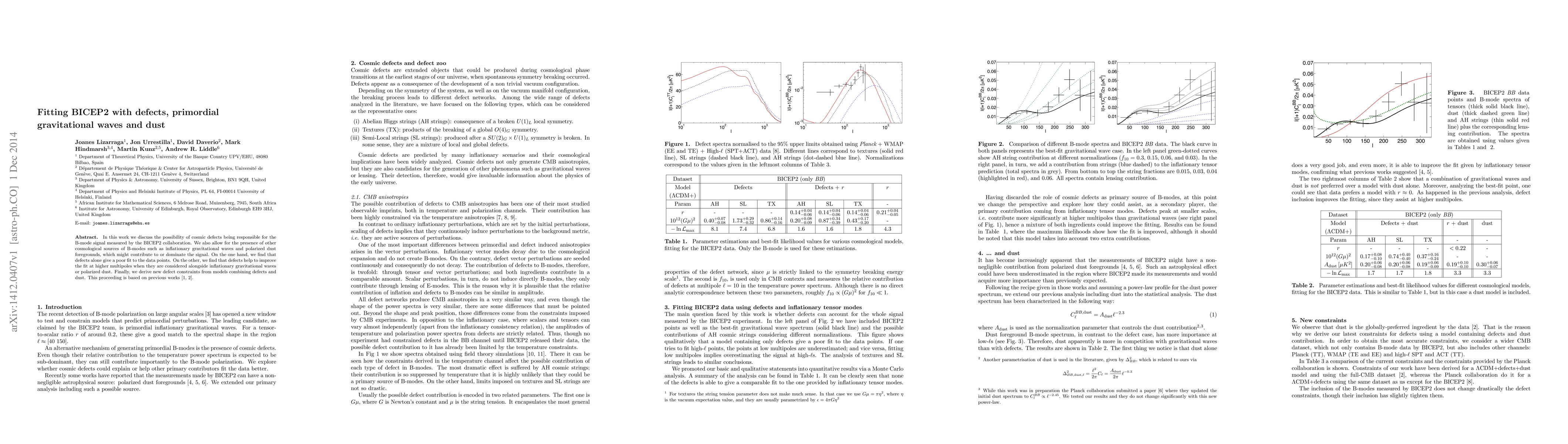 In this work we discuss the possibility of cosmic defects being responsible for the B-mode signal measured by the BICEP2 collaboration. We also allow for the presence of other cosmological sources of B-modes such as inflationary gravitational waves and polarized dust foregrounds, which might contribute to or dominate the signal. On the one hand, we find that defects alone give a poor fit to the data points. On the other, we find that defects help to improve the fit at higher multipoles when they are considered alongside inflationary gravitational waves or polarized dust. Finally, we derive new defect constraints from models combining defects and dust. This proceeding is based on previous works [1,2].