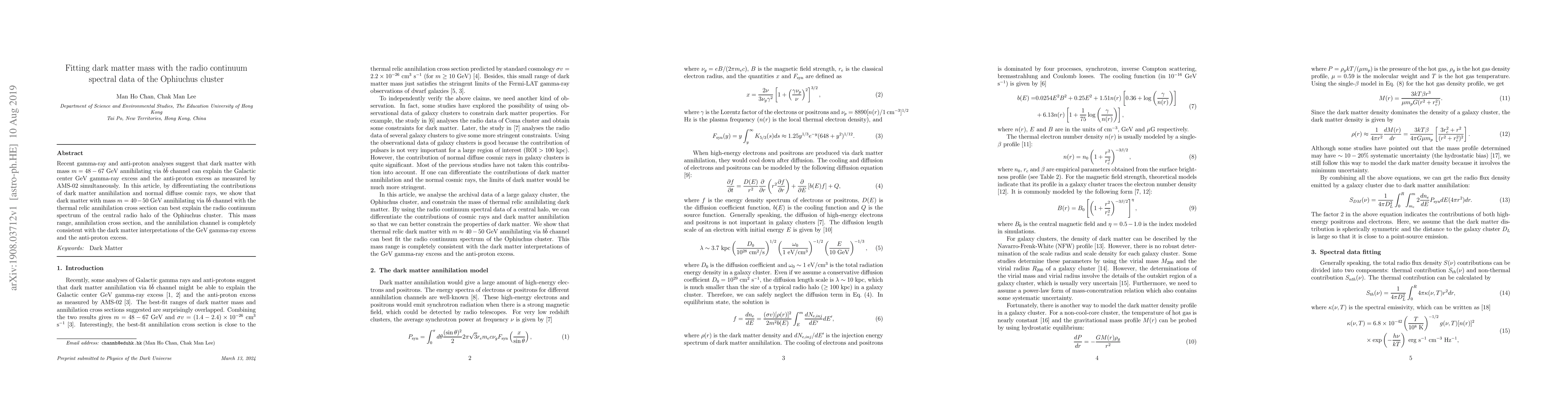 Recent gamma-ray and anti-proton analyses suggest that dark matter with mass $m=48-67$ GeV annihilating via $b\bar{b}$ channel can explain the Galactic center GeV gamma-ray excess and the anti-proton excess as measured by AMS-02 simultaneously. In this article, by differentiating the contributions of dark matter annihilation and normal diffuse cosmic rays, we show that dark matter with mass $m=40-50$ GeV annihilating via $b\bar{b}$ channel with the thermal relic annihilation cross section can best explain the radio continuum spectrum of the central radio halo of the Ophiuchus cluster. This mass range, annihilation cross section, and the annihilation channel is completely consistent with the dark matter interpretations of the GeV gamma-ray excess and the anti-proton excess.