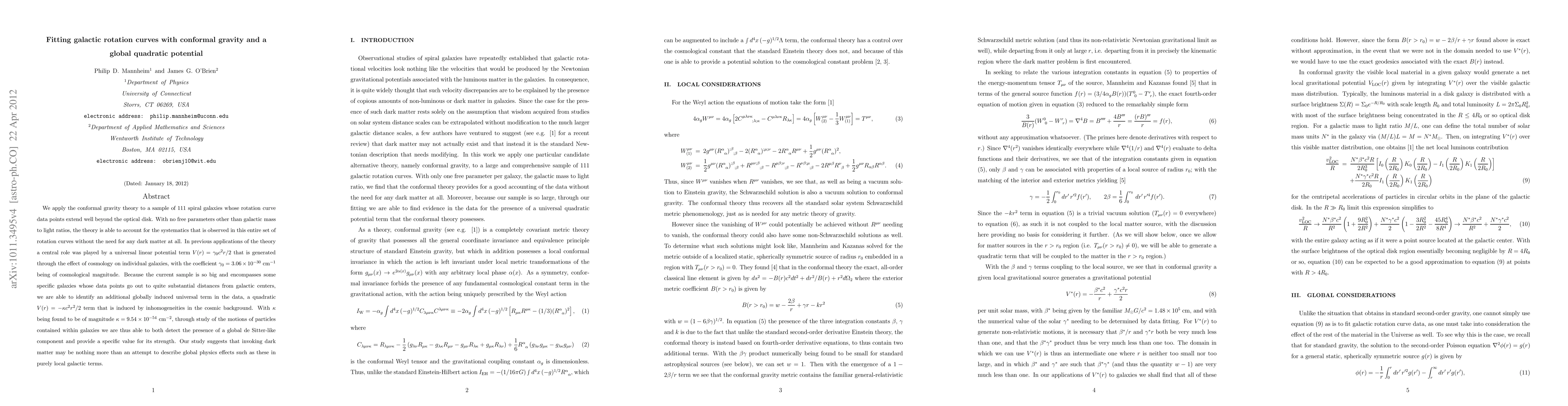 This research applies conformal gravity theory to 111 spiral galaxies' rotation curves, successfully fitting them without dark matter. It identifies a new global quadratic potential term, suggesting that dark matter might be an attempt to explain cosmic effects locally.