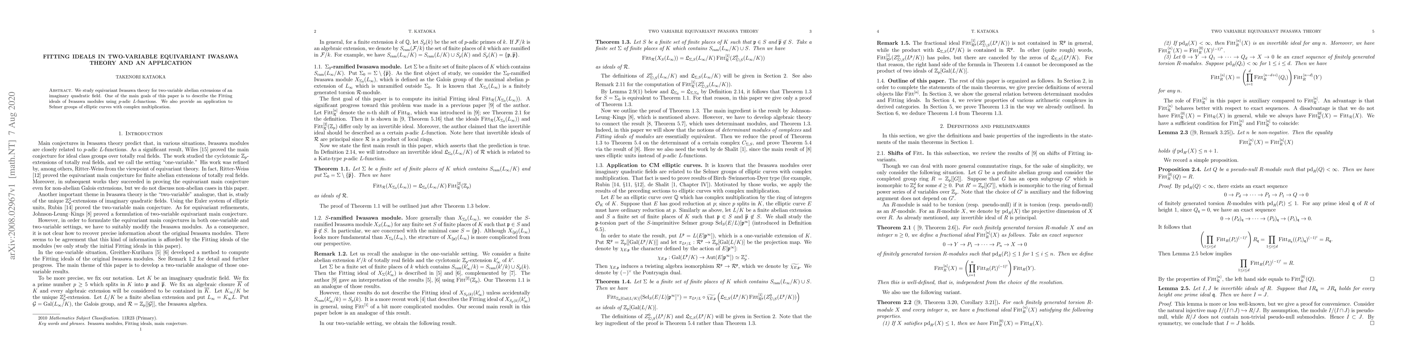 This paper explores equivariant Iwasawa theory for two-variable abelian extensions of imaginary quadratic fields, focusing on the Fitting ideals of Iwasawa modules via $p$-adic $L$-functions, and applies these findings to the Selmer groups of elliptic curves with complex multiplication.