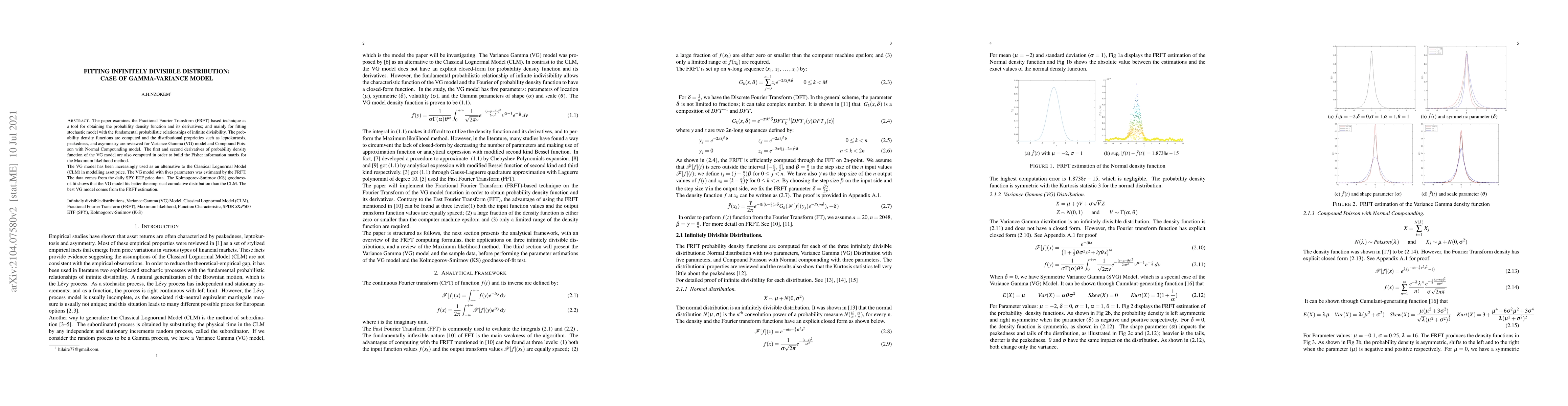 The paper examines the Fractional Fourier Transform (FRFT) based technique as a tool for obtaining probability density function and its derivatives, and mainly for fitting stochastic model with the fundamental probabilistic relationships of infinite divisibility. The probability density functions are computed and the distributional proprieties such as leptokurtosis, peakedness, and asymmetry are reviewed for Variance-Gamma (VG) model and Compound Poisson with Normal Compounding model. The first and second derivatives of probability density function of the VG model are also computed in order to build the Fisher information matrix for the Maximum likelihood method. The VG model has been increasingly used as an alternative to the Classical Lognormal Model (CLM) in modelling asset price. The VG model with fives parameters was estimated by the FRFT. The data comes from the daily SPY ETF price data. The Kolmogorov-Smirnov (KS) goodness-of-fit shows that the VG model fits better the empirical cumulative distribution than the CLM. The best VG model comes from the FRFT estimation.