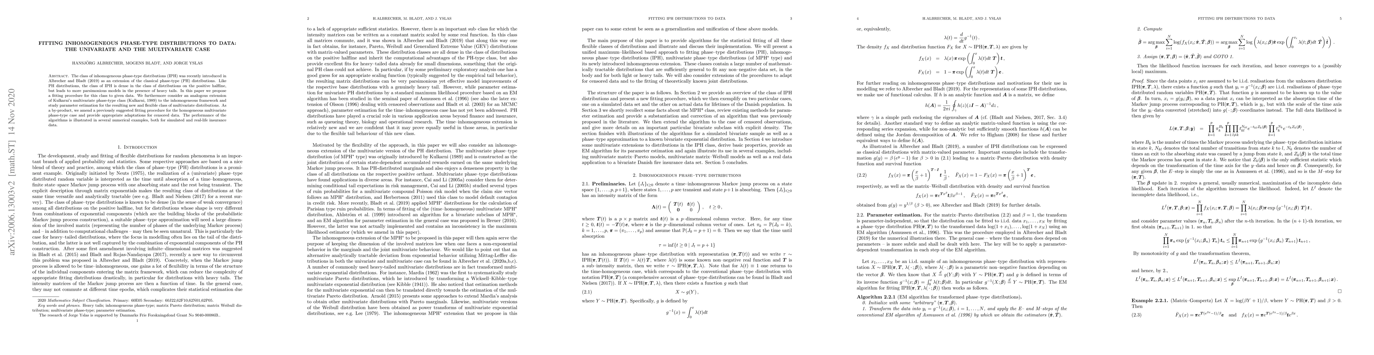 The class of inhomogeneous phase-type distributions (IPH) was recently introduced in Albrecher and Bladt (2019) as an extension of the classical phase-type (PH) distributions. Like PH distributions, the class of IPH is dense in the class of distributions on the positive halfline, but leads to more parsimonious models in the presence of heavy tails. In this paper we propose a fitting procedure for this class to given data. We furthermore consider an analogous extension of Kulkarni's multivariate phase-type class (Kulkarni, 1989) to the inhomogeneous framework and study parameter estimation for the resulting new and flexible class of multivariate distributions. As a by-product, we amend a previously suggested fitting procedure for the homogeneous multivariate phase-type case and provide appropriate adaptations for censored data. The performance of the algorithms is illustrated in several numerical examples, both for simulated and real-life insurance data.