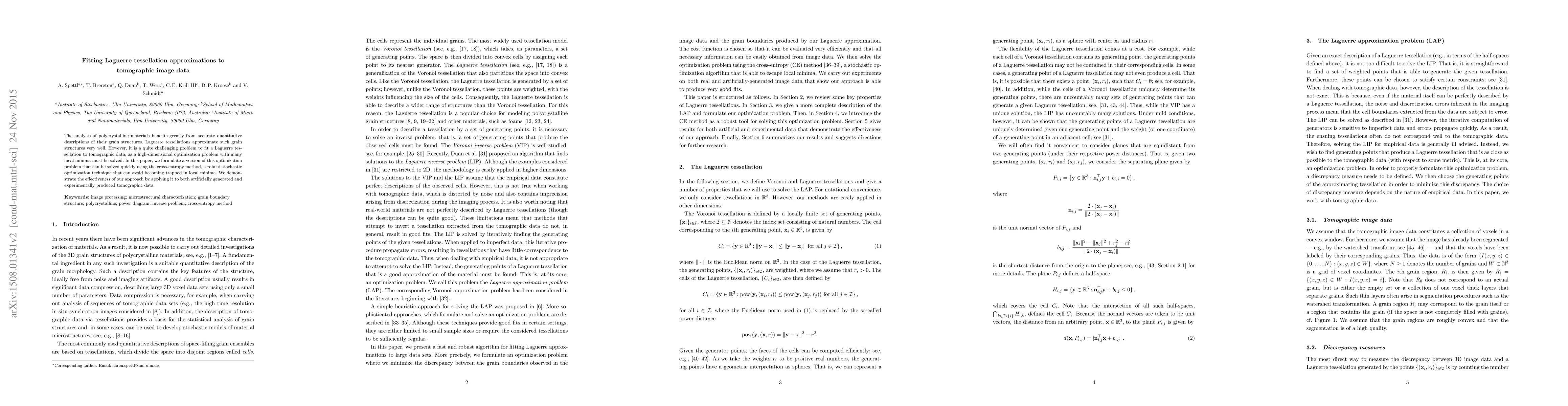 This paper proposes a cross-entropy method for efficiently fitting Laguerre tessellation approximations to tomographic image data of polycrystalline materials, addressing the high-dimensional optimization challenge and avoiding local minima. The effectiveness of the approach is validated through both synthetic and real experimental data.