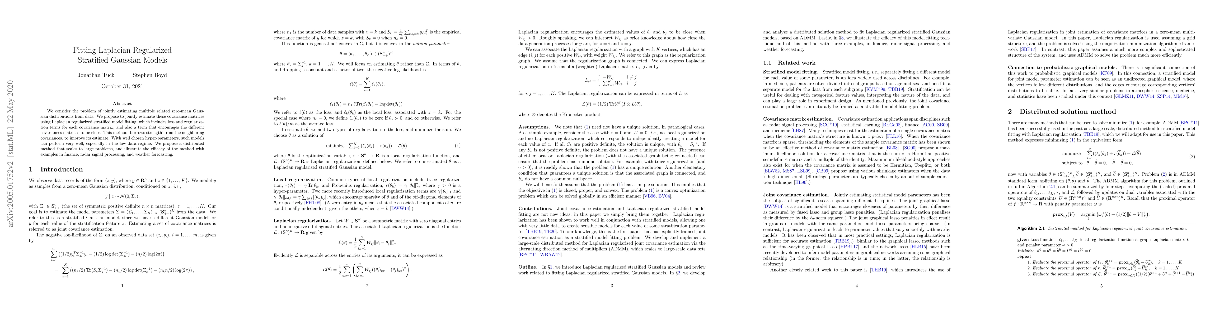 This paper proposes a Laplacian regularized stratified Gaussian model fitting method to jointly estimate multiple related zero-mean Gaussian distributions, leveraging neighboring covariance matrices to improve estimates. The method scales to large datasets and is demonstrated to be effective in finance, radar signal processing, and weather forecasting.