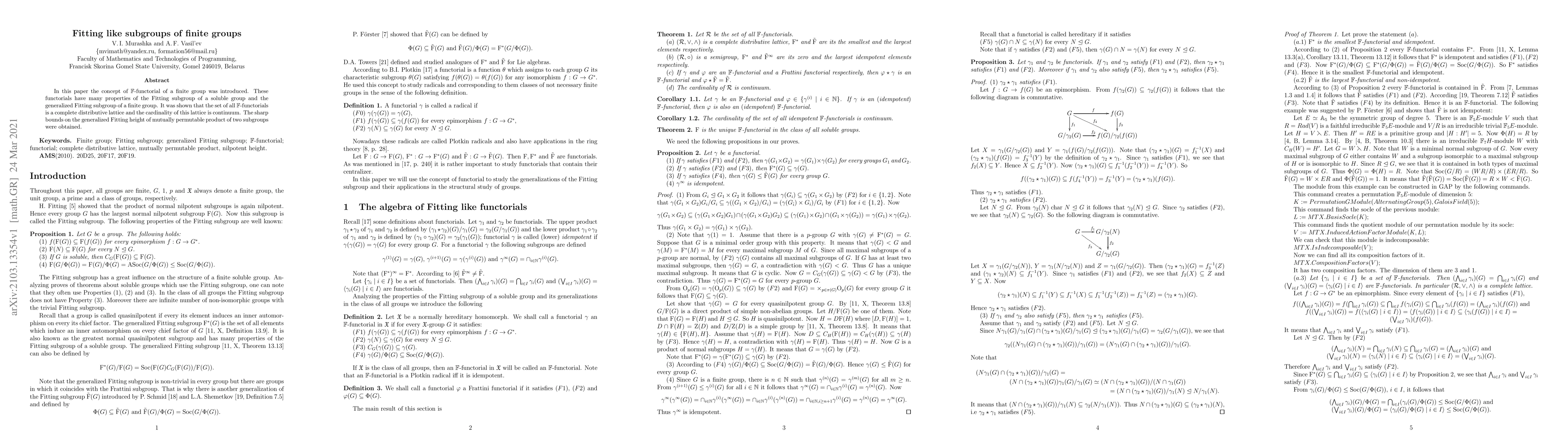 In this paper the concept of $\mathbb{F}$-functorial of a finite group was introduced. These functorials have many properties of the Fitting subgroup of a soluble group and the generalized Fitting subgroup of a finite group. It was shown that the set of all $\mathbb{F}$-functorials is a complete distributive lattice and the cardinality of this lattice is continuum. The sharp bounds on the generalized Fitting height of mutually permutable product of two subgroups were obtained.