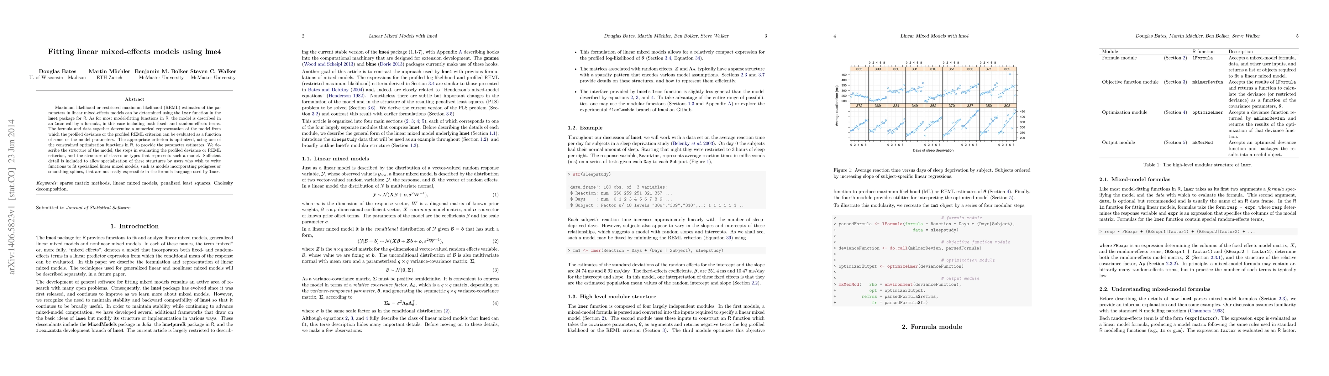 This paper details the use of the `lmer` function in R's `lme4` package for fitting linear mixed-effects models, explaining the optimization of maximum likelihood or REML criteria to estimate model parameters, and providing a framework for users to develop specialized mixed models.