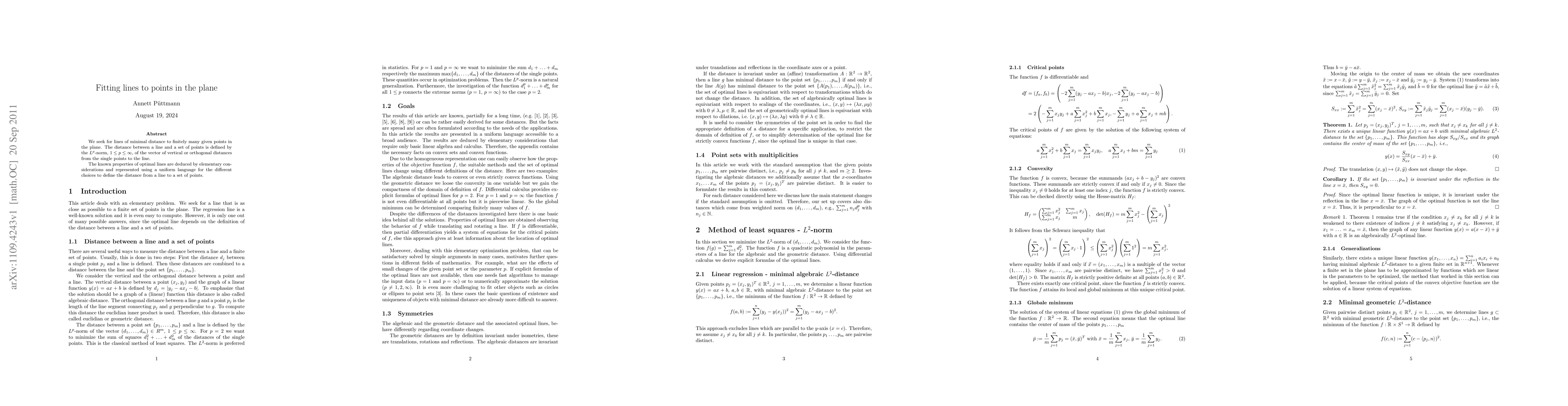 This paper explores the concept of lines minimally distant to a set of points in a plane, utilizing the L^p-norm for distance measurement (1≤ p≤ ∞). It deduces properties of such optimal lines via elementary reasoning and presents them in a unified language for varying distance definitions from a line to a point set.