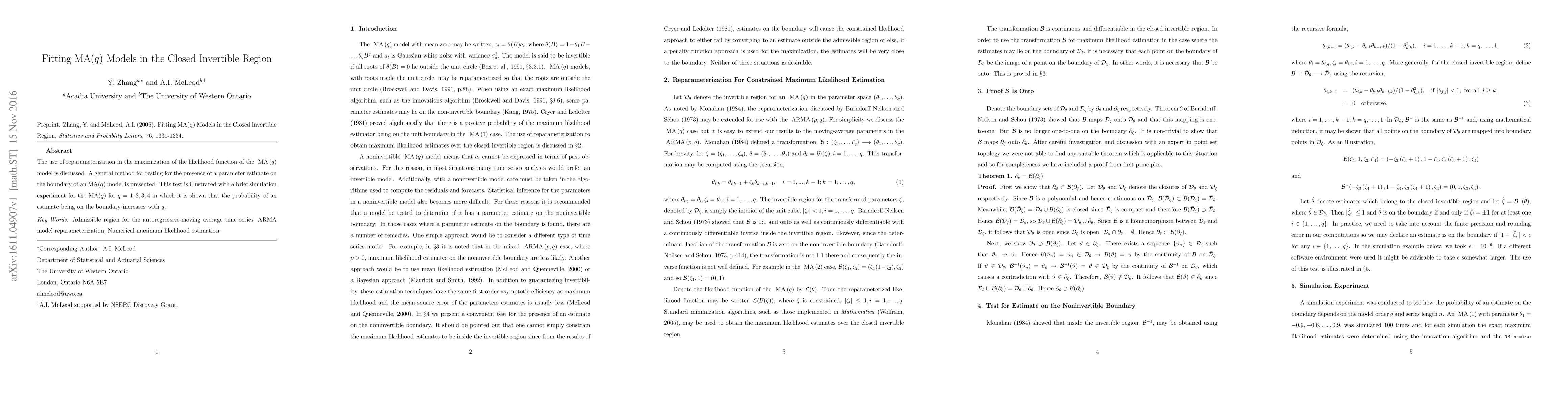 This paper discusses a reparameterization method to optimize MA(q) model likelihood. It introduces a test to detect if a parameter estimate is on the boundary, demonstrated via simulations for q=1 to 4, showing the boundary estimate probability rises with increasing q.