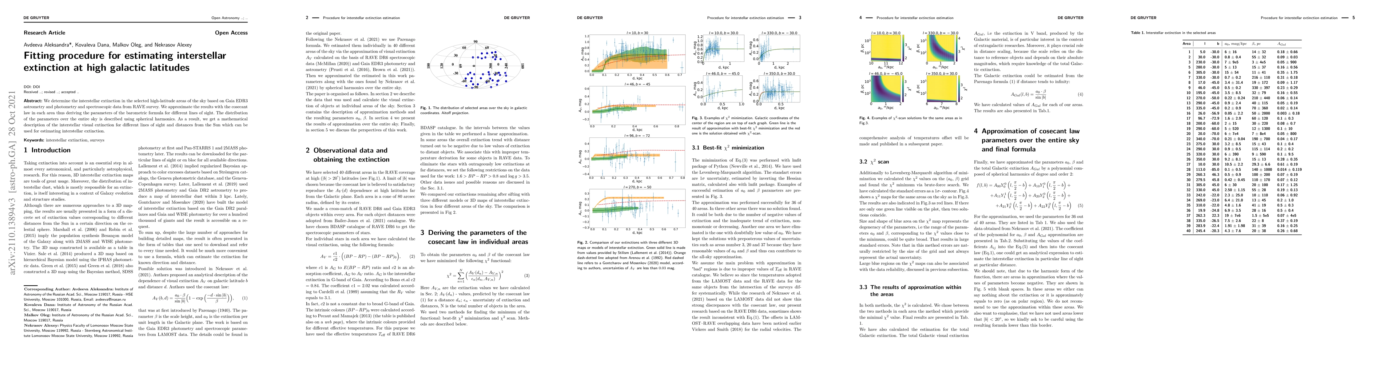 This paper develops a fitting procedure to estimate interstellar extinction at high galactic latitudes using Gaia EDR3 data and RAVE spectroscopic data, approximating results with a cosecant law and describing parameters with spherical harmonics. The resulting mathematical model provides a comprehensive method for estimating interstellar visual extinction across various lines of sight and distances from the Sun.