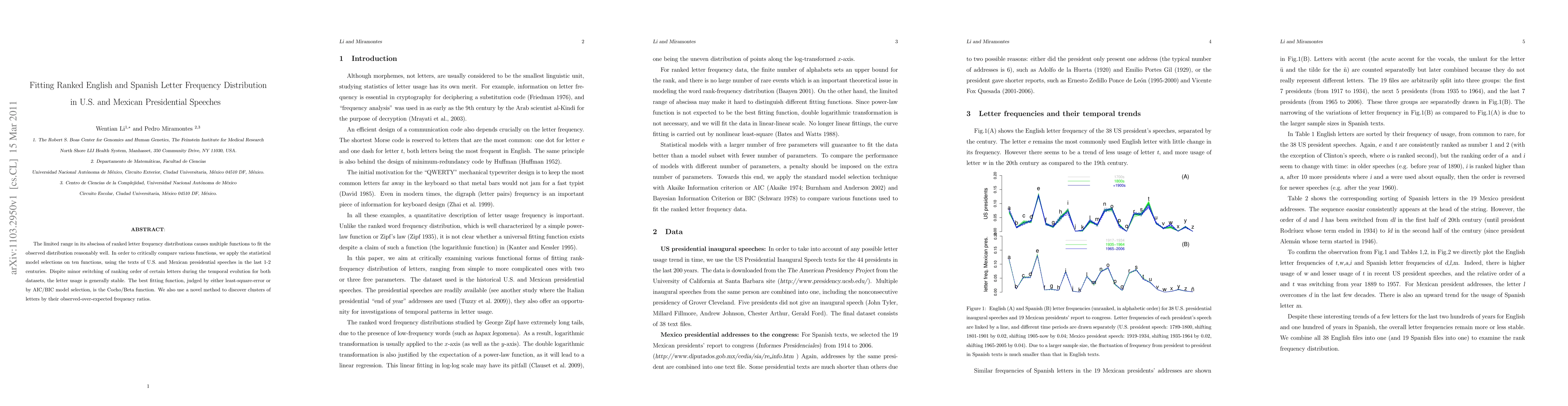 The limited range in its abscissa of ranked letter frequency distributions causes multiple functions to fit the observed distribution reasonably well. In order to critically compare various functions, we apply the statistical model selections on ten functions, using the texts of U.S. and Mexican presidential speeches in the last 1-2 centuries. Dispite minor switching of ranking order of certain letters during the temporal evolution for both datasets, the letter usage is generally stable. The best fitting function, judged by either least-square-error or by AIC/BIC model selection, is the Cocho/Beta function. We also use a novel method to discover clusters of letters by their observed-over-expected frequency ratios.