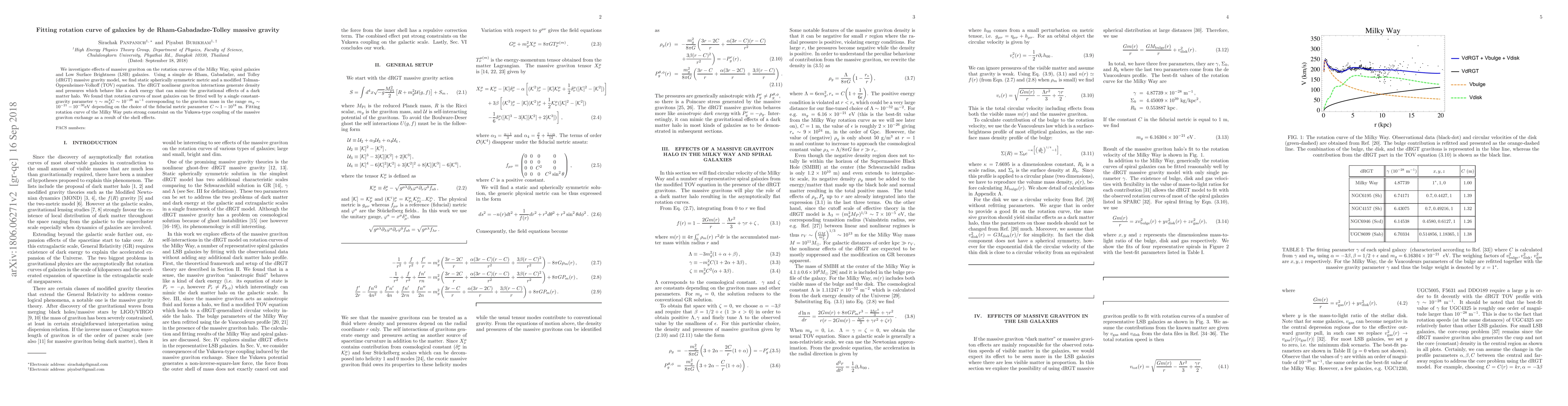 We investigate effects of massive graviton on the rotation curves of the Milky Way, spiral galaxies and Low Surface Brightness~(LSB) galaxies. Using a simple de Rham, Gabadadze, and Tolley (dRGT) massive gravity model, we find static spherically symmetric metric and a modified Tolman-Oppenheimer-Volkoff (TOV) equation. The dRGT nonlinear graviton interactions generate density and pressures which behave like a dark energy that can mimic the gravitational effects of a dark matter halo. We found that rotation curves of most galaxies can be fitted well by a single constant-gravity parameter $\gamma \sim m_{g}^{2}C \sim 10^{-28}~{\rm m^{-1}}$ corresponding to the graviton mass in the range $m_g \sim 10^{-21}-10^{-30} {\rm eV}$ depending on the choice of the fiducial metric parameter $C\sim 1-10^{18}~\text{m}$. Fitting rotation curve of the Milky Way puts strong constraint on the Yukawa-type coupling of the massive graviton exchange as a result of the shell effects.