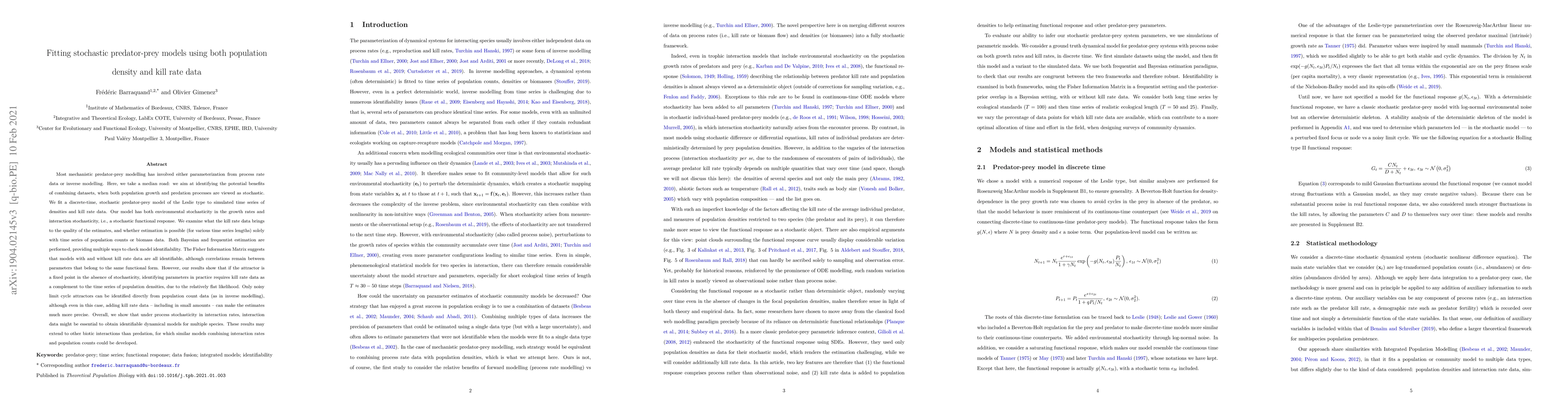 This research combines population density and kill rate data to fit a stochastic predator-prey model, finding that kill rate data is essential for accurate parameter estimation, especially under environmental stochasticity. The study suggests this approach may extend to other biotic interactions.