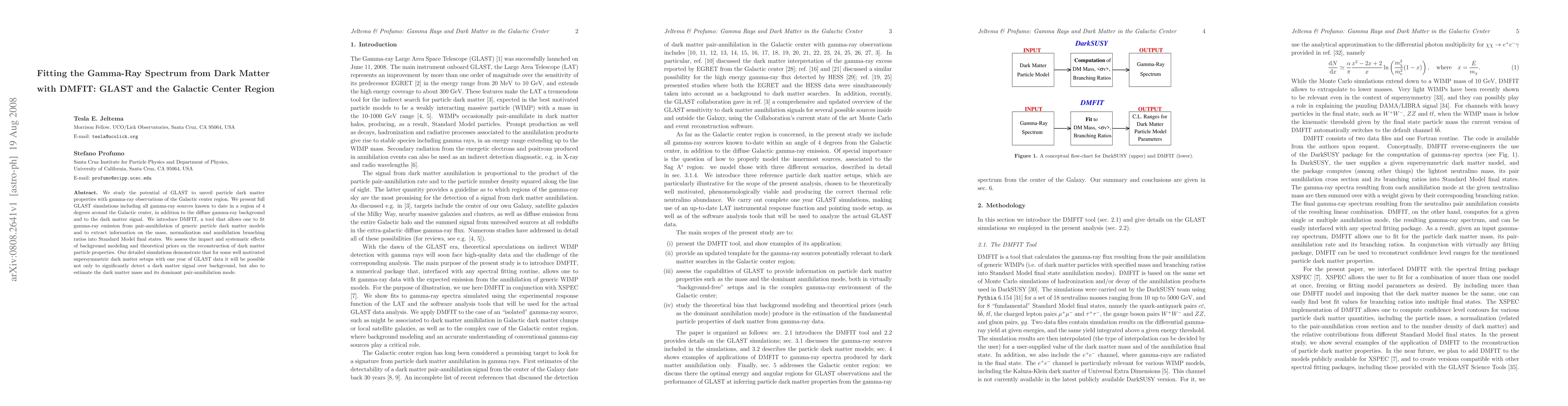 This paper investigates GLAST's capability to reveal particle dark matter properties via gamma-ray observations of the Galactic center, employing DMFIT to fit gamma-ray emission from dark matter annihilation. Simulations show that GLAST can detect dark matter signals and estimate its mass and annihilation modes with a year of data.