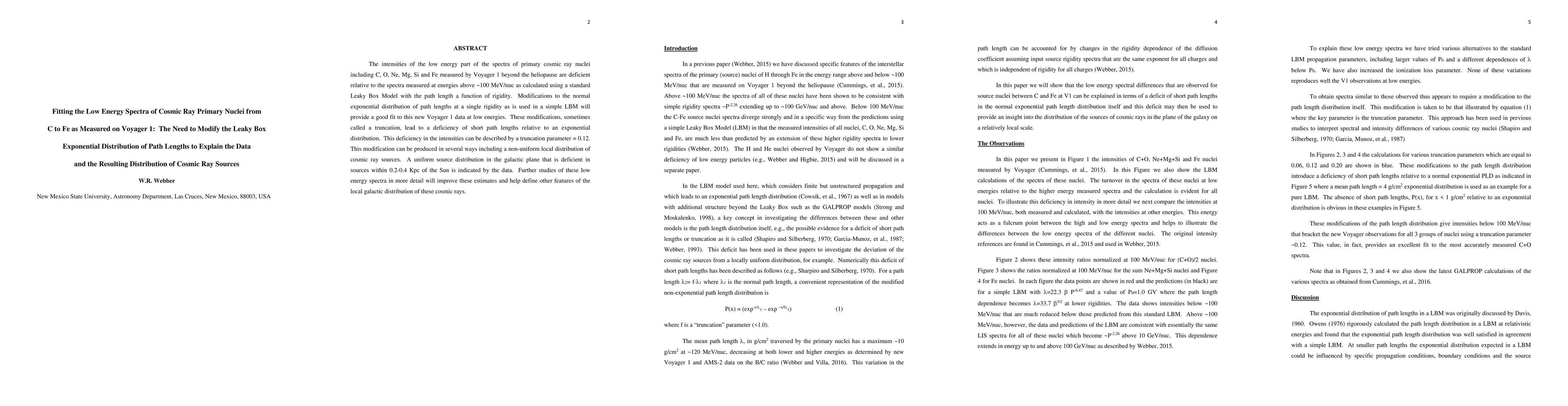 The intensities of the low energy part of the spectra of primary cosmic ray nuclei including C, O, Ne, Mg, Si and Fe measured by Voyager 1 beyond the heliopause are deficient relative to the spectra measured at energies above ~100 MeV/nuc as calculated using a standard Leaky Box Model with the path length a function of rigidity. Modifications to the normal exponential distribution of path lengths at a single rigidity as is used in a simple LBM will provide a good fit to this new Voyager 1 data at low energies. These modifications, sometimes called a truncation, lead to a deficiency of short path lengths relative to an exponential distribution. This deficiency in the intensities can be described by a truncation parameter = 0.12. This modification can be produced in several ways including a non-uniform local distribution of cosmic ray sources. A uniform source distribution in the galactic plane that is deficient in sources within 0.2-0.4 Kpc of the Sun is indicated by the data. Further studies of these low energy spectra in more detail will improve these estimates and help define other features of the local galactic distribution of these cosmic rays.