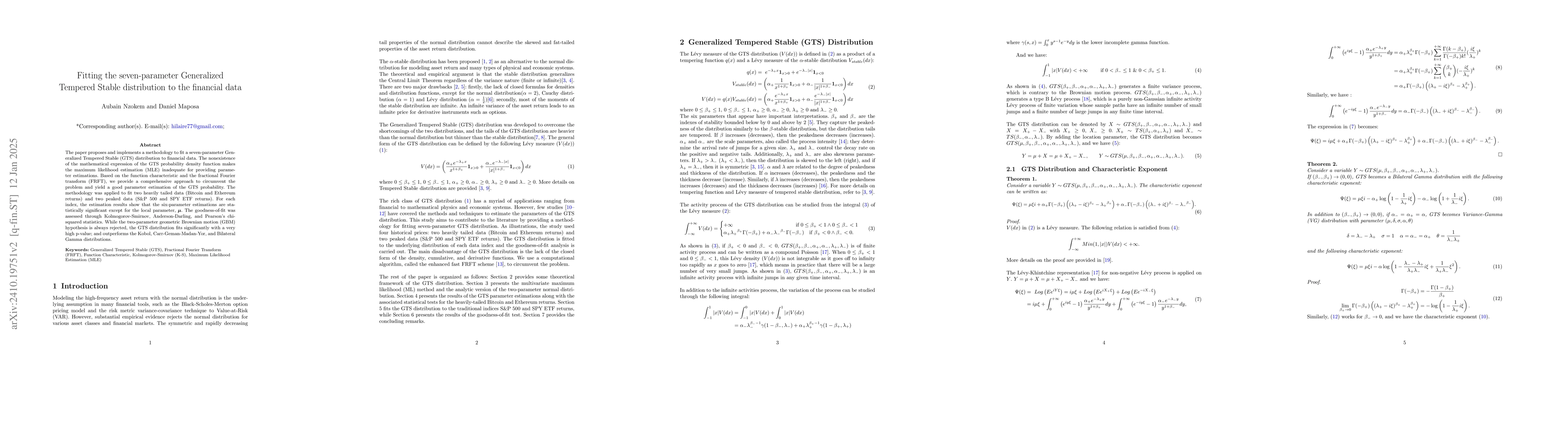 The paper develops a novel methodology to fit a seven-parameter Generalized Tempered Stable (GTS) distribution to financial data, overcoming the challenge of MLE inaccuracy due to the absence of a GTS probability density function. The applied GTS distribution significantly outperforms GBM, Kobold, CGMY, and Bilateral Gamma models, with high P-values and statistical significance in six out of seven parameters.