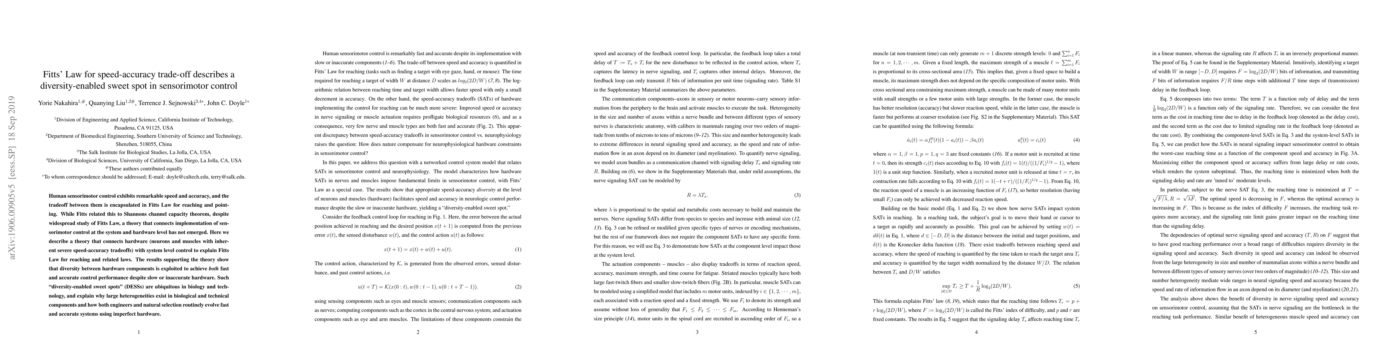 This paper proposes a theory linking hardware components' inherent speed-accuracy tradeoffs to system-level sensorimotor control, explaining Fitts' Law. It demonstrates that diversity among hardware components enables "diversity-enabled sweet spots," allowing for both fast and accurate performance despite imperfect components.
