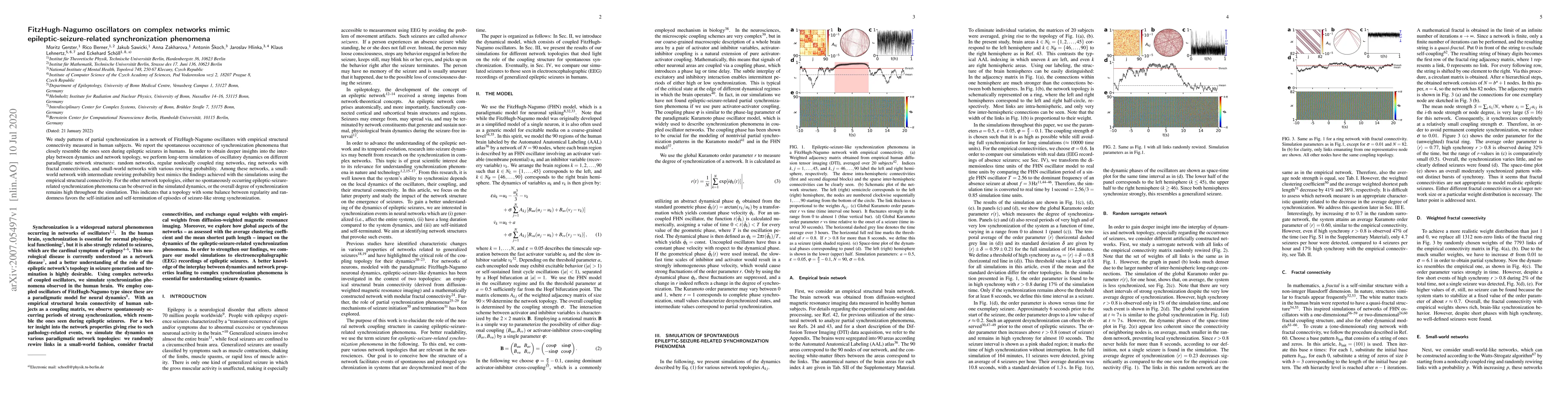 We study patterns of partial synchronization in a network of FitzHugh-Nagumo oscillators with empirical structural connectivity measured in human subjects. We report the spontaneous occurrence of synchronization phenomena that closely resemble the ones seen during epileptic seizures in humans. In order to obtain deeper insights into the interplay between dynamics and network topology, we perform long-term simulations of oscillatory dynamics on different paradigmatic network structures: random networks, regular nonlocally coupled ring networks, ring networks with fractal connectivities, and small-world networks with various rewiring probability. Among these networks, a small-world network with intermediate rewiring probability best mimics the findings achieved with the simulations using the empirical structural connectivity. For the other network topologies, either no spontaneously occurring epileptic-seizure-related synchronization phenomena can be observed in the simulated dynamics, or the overall degree of synchronization remains high throughout the simulation. This indicates that a topology with some balance between regularity and randomness favors the self-initiation and self-termination of episodes of seizure-like strong synchronization.