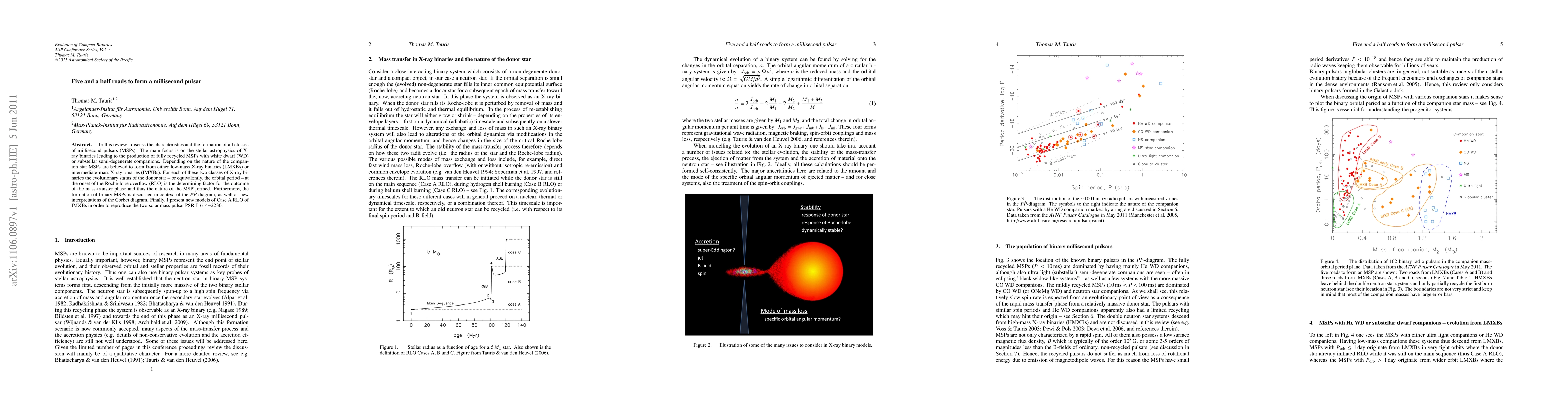 In this review I discuss the characteristics and the formation of all classes of millisecond pulsars (MSPs). The main focus is on the stellar astrophysics of X-ray binaries leading to the production of fully recycled MSPs with white dwarf (WD) or substellar semi-degenerate companions. Depending on the nature of the companion star MSPs are believed to form from either low-mass X-ray binaries (LMXBs) or intermediate-mass X-ray binaries (IMXBs). For each of these two classes of X-ray binaries the evolutionary status of the donor star -- or equivalently, the orbital period -- at the onset of the Roche-lobe overflow (RLO) is the determining factor for the outcome of the mass-transfer phase and thus the nature of the MSP formed. Furthermore, the formation of binary MSPs is discussed in context of the (P,P_dot)-diagram, as well as new interpretations of the Corbet diagram. Finally, I present new models of Case A RLO of IMXBs in order to reproduce the two solar mass pulsar PSR J1614-2230.