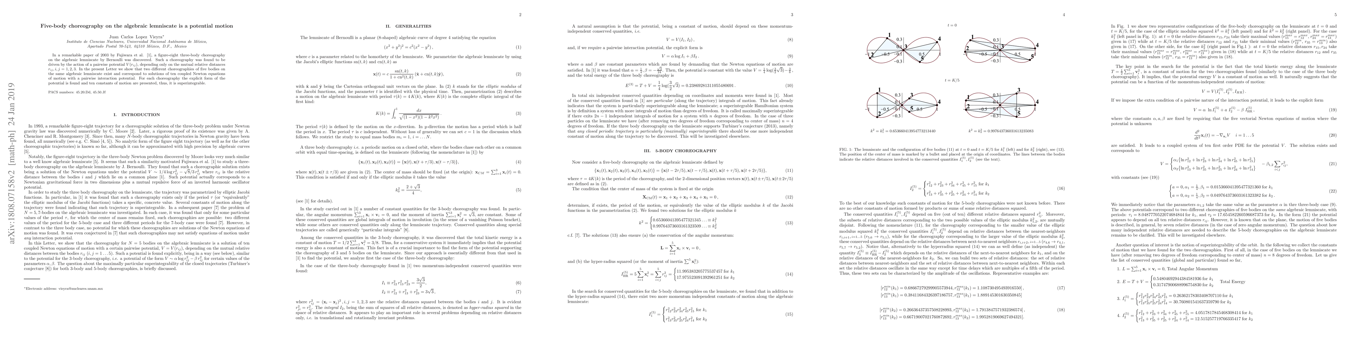 In a remarkable paper of 2003 by Fujiwara et al. \cite{Fujiwara2003}, a figure-eight three-body choreography on the algebraic lemniscate by Bernoulli was discovered. Such a choreography was found to be driven by the action of a pairwise potential $ V(r_{ij}) $, depending only on the mutual relative distances $r_{ij}, i,j=1,2,3$. In the present Letter we show that two different choreographies of five bodies on the same algebraic lemniscate exist and correspond to solutions of ten coupled Newton equations of motion with a pairwise interaction potential. For each choreography the explicit form of the potential is found and ten constants of motion are presented, thus, it is superintegrable.
