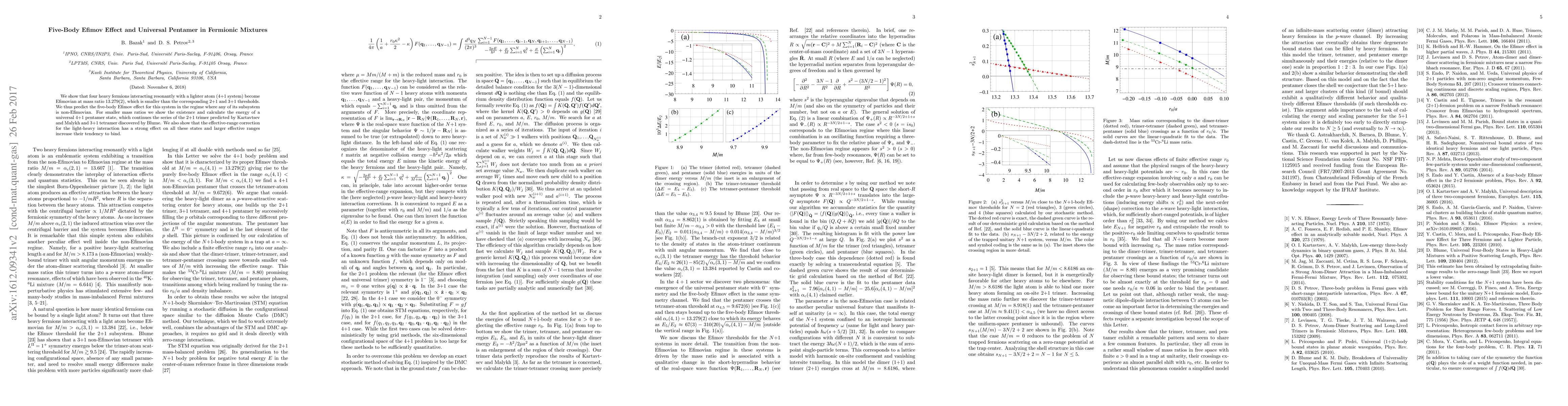 We show that four heavy fermions interacting resonantly with a lighter atom (4+1 system) become Efimovian at mass ratio 13.279(2), which is smaller than the corresponding 2+1 and 3+1 thresholds. We thus predict the five-body Efimov effect for this system in the regime where any of its subsystem is non- Efimovian. For smaller mass ratios we show the existence and calculate the energy of a universal 4+1 pentamer state, which continues the series of the 2+1 trimer predicted by Kartavtsev and Malykh and 3+1 tetramer discovered by Blume. We also show that the effective-range correction for the light-heavy interaction has a strong effect on all these states and larger effective ranges increase their tendency to bind.
