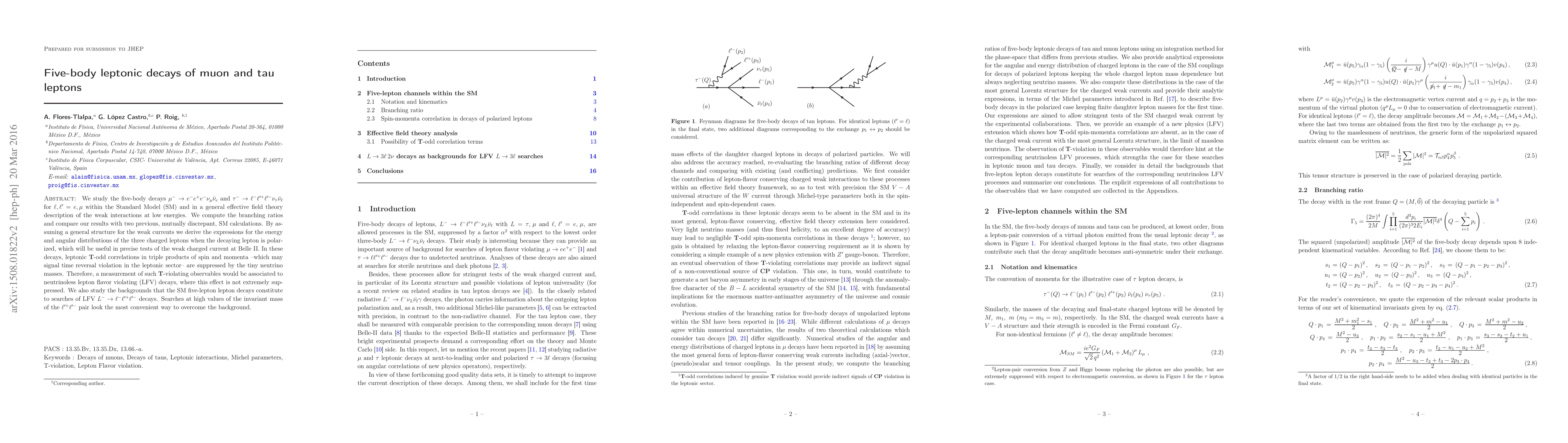 We study the five-body decays $\mu^- \to e^- e^+ e^- \nu_{\mu} \bar{\nu}_{e}$ and $\tau^- \to \ell^- \ell'^+\ell'^-\nu_{\tau}\bar{\nu}_{\ell}$ for $\ell, \ell'=e, \mu$ within the Standard Model (SM) and in a general effective field theory description of the weak interactions at low energies. We compute the branching ratios and compare our results with two previous, mutually discrepant, SM calculations. By assuming a general structure for the weak currents we derive the expressions for the energy and angular distributions of the three charged leptons when the decaying lepton is polarized, which will be useful in precise tests of the weak charged current at Belle II. In these decays, leptonic $\mathbf{T}$-odd correlations in triple products of spin and momenta --which may signal time reversal violation in the leptonic sector-- are suppressed by the tiny neutrino masses. Therefore, a measurement of such $\mathbf{T}$-violating observables would be associated to neutrinoless lepton flavor violating (LFV) decays, where this effect is not extremely suppressed. We also study the backgrounds that the SM five-lepton lepton decays constitute to searches of LFV $L^- \to \ell^- \ell'^+\ell'^-$ decays. Searches at high values of the invariant mass of the $\ell'^+\ell'^-$ pair look the most convenient way to overcome the background.