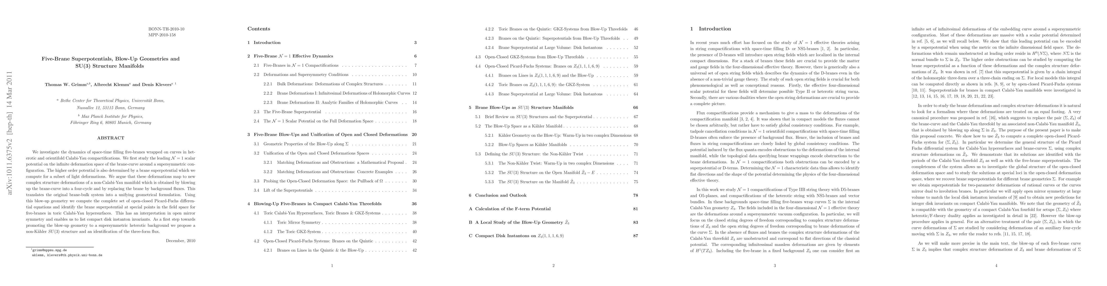 We investigate the dynamics of space-time filling five-branes wrapped on curves in heterotic and orientifold Calabi-Yau compactifications. We first study the leading N=1 scalar potential on the infinite deformation space of the brane-curve around a supersymmetric configuration. The higher order potential is also determined by a brane superpotential which we compute for a subset of light deformations. We argue that these deformations map to new complex structure deformations of a non-Calabi-Yau manifold which is obtained by blowing up the brane-curve into a four-cycle and by replacing the brane by background fluxes. This translates the original brane-bulk system into a unifying geometrical formulation. Using this blow-up geometry we compute the complete set of open-closed Picard-Fuchs differential equations and identify the brane superpotential at special points in the field space for five-branes in toric Calabi-Yau hypersurfaces. This has an interpretation in open mirror symmetry and enables us to list compact disk instanton invariants. As a first step towards promoting the blow-up geometry to a supersymmetric heterotic background we propose a non-Kaehler SU(3) structure and an identification of the three-form flux.