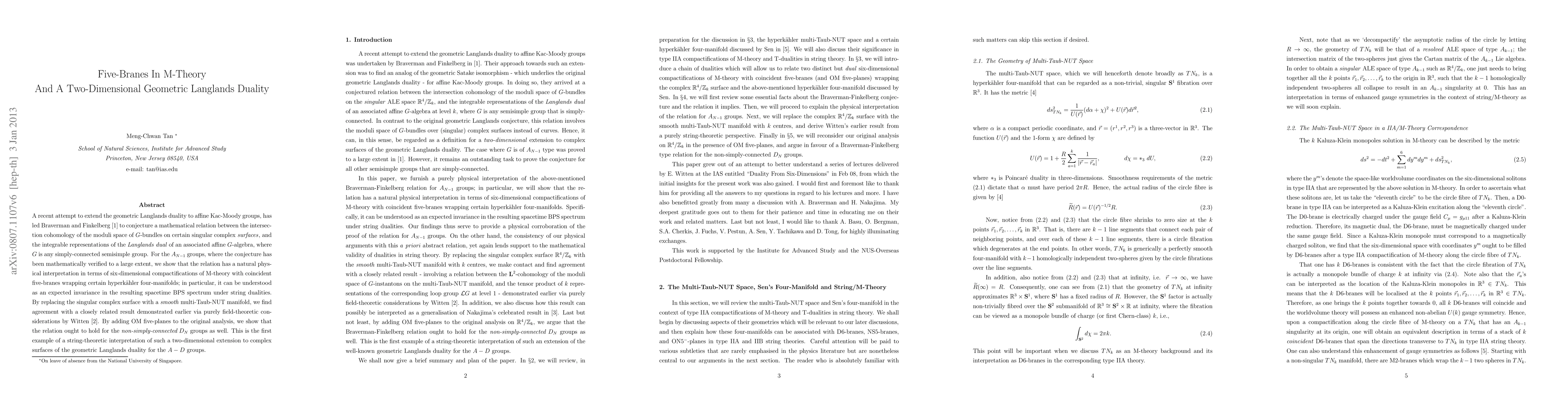 This paper proposes a physical interpretation of an extended geometric Langlands duality for A-type groups through M-theory compactifications with five-branes, and suggests a similar relation for D-type groups by incorporating OM five-planes, providing the first string-theoretic insight into this two-dimensional extension of the geometric Langlands conjecture.