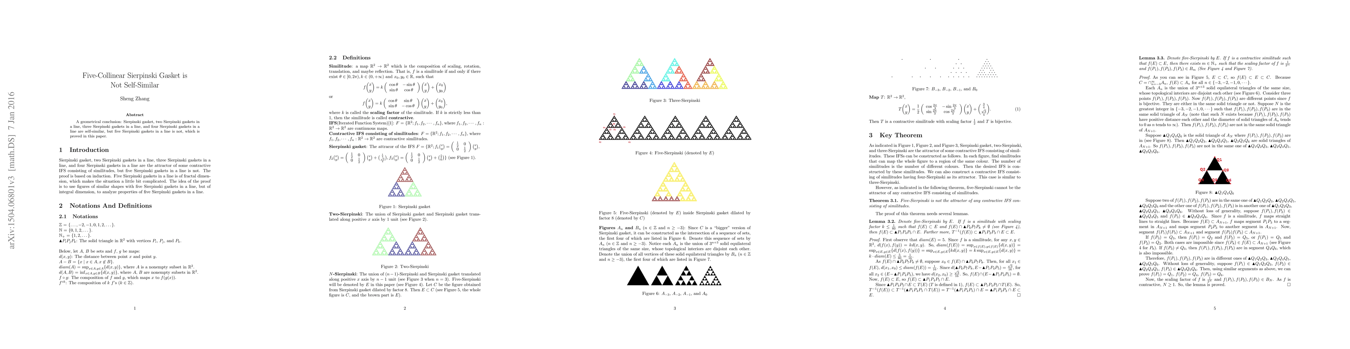A geometrical conclusion: Sierpinski gasket, two Sierpinski gaskets in a line, three Sierpinski gaskets in a line, and four Sierpinski gaskets in a line are self-similar, but five Sierpinski gaskets in a line is not, which is proved in this paper.