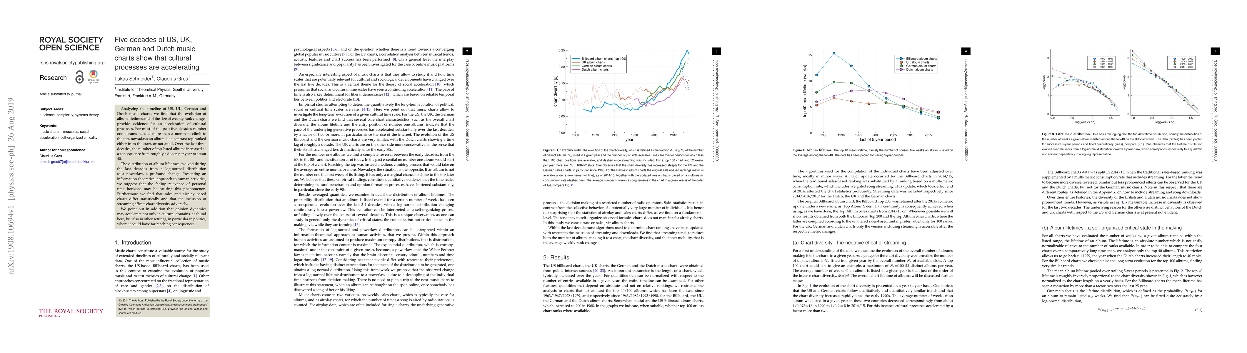 Analyzing the timeline of US, UK, German and Dutch music charts, we find that the evolution of album lifetimes and of the size of weekly rank changes provide evidence for an acceleration of cultural processes. For most of the past five decades number one albums needed more than a month to climb to the top, nowadays an album is in contrast top ranked either from the start, or not at all. Over the last three decades, the number of top-listed albums increased as a consequence from roughly a dozen per year to about 40. The distribution of album lifetimes evolved during the last decades from a log-normal distribution to a powerlaw, a profound change. Presenting an information-theoretical approach to human activities, we suggest that the fading relevance of personal time horizons may be causing this phenomenon. Furthermore we find that sales and airplay based charts differ statistically and that the inclusion of streaming affects chart diversity adversely. We point out in addition that opinion dynamics may accelerate not only in cultural domains, as found here, but also in other settings, in particular in politics, where it could have far reaching consequences.