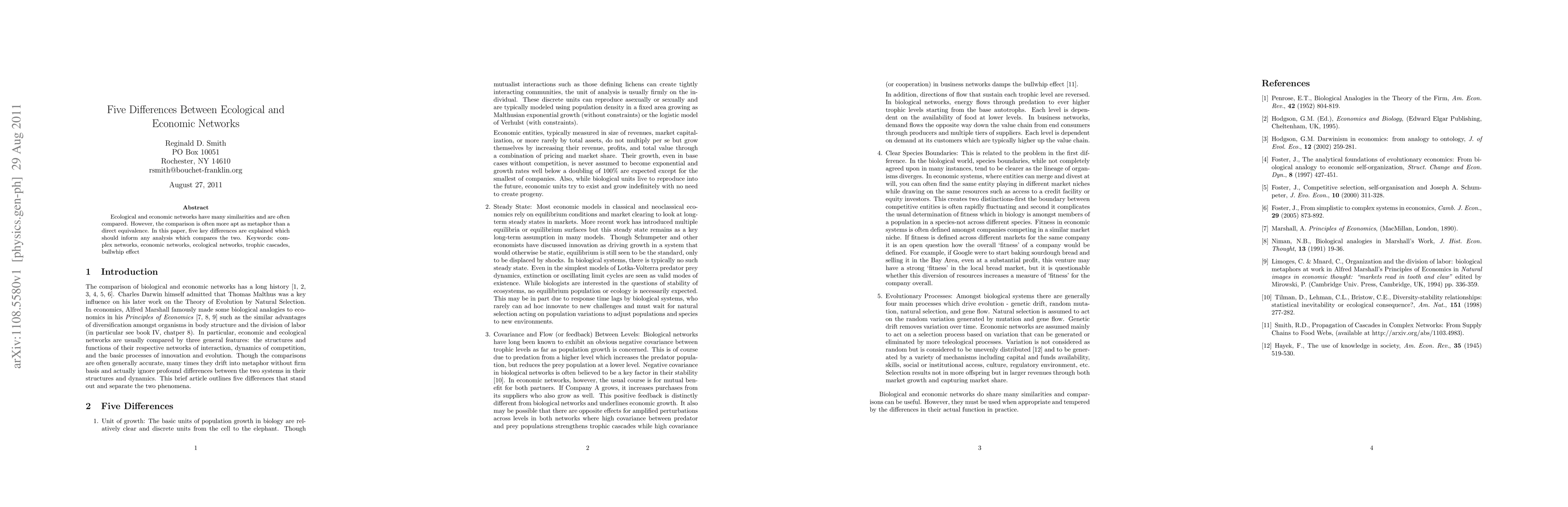 This paper elucidates five distinct differences between ecological and economic networks, emphasizing that while they share similarities, their unique characteristics should guide comparative analyses. The identified differences highlight the nuanced distinctions that inform the study of these complex systems.