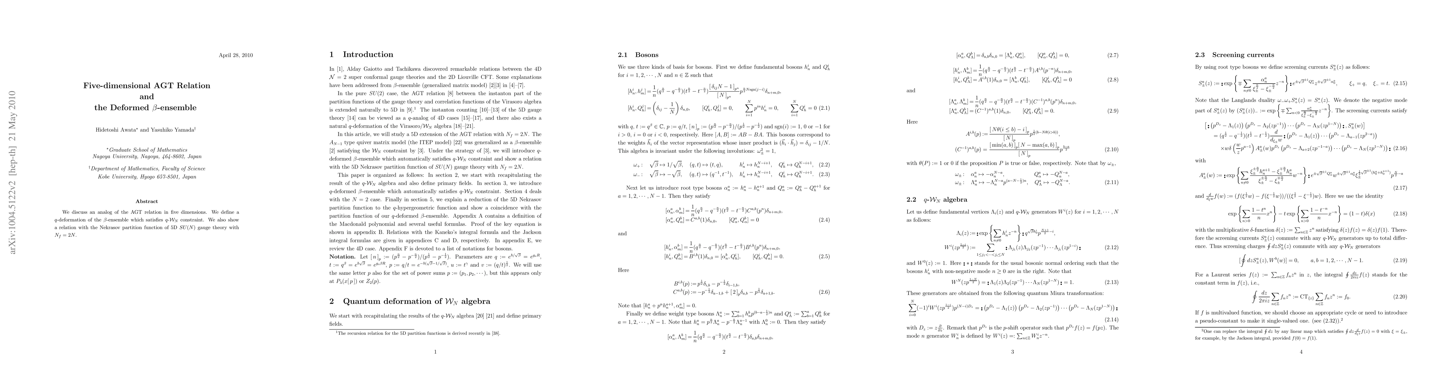 Summary: This paper explores a five-dimensional extension of the AGT relation, introduces a q-deformed beta-ensemble, and demonstrates its connection to the Nekrasov partition function in 5D SU(N) gauge theory with equal numbers of flavors and colors.