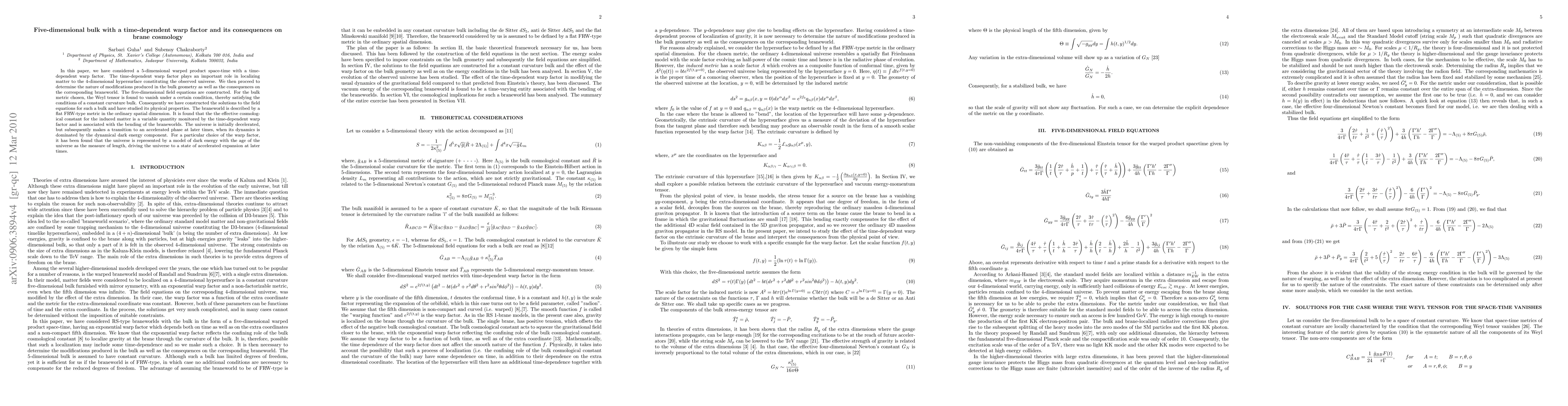 This paper explores a 5-dimensional warped space-time with a time-dependent warp factor, which localizes matter on a 4-dimensional brane. The study reveals the bulk geometry modifications and their consequences on brane cosmology, showing that the universe transitions from deceleration to accelerated expansion driven by a dynamical dark energy component.