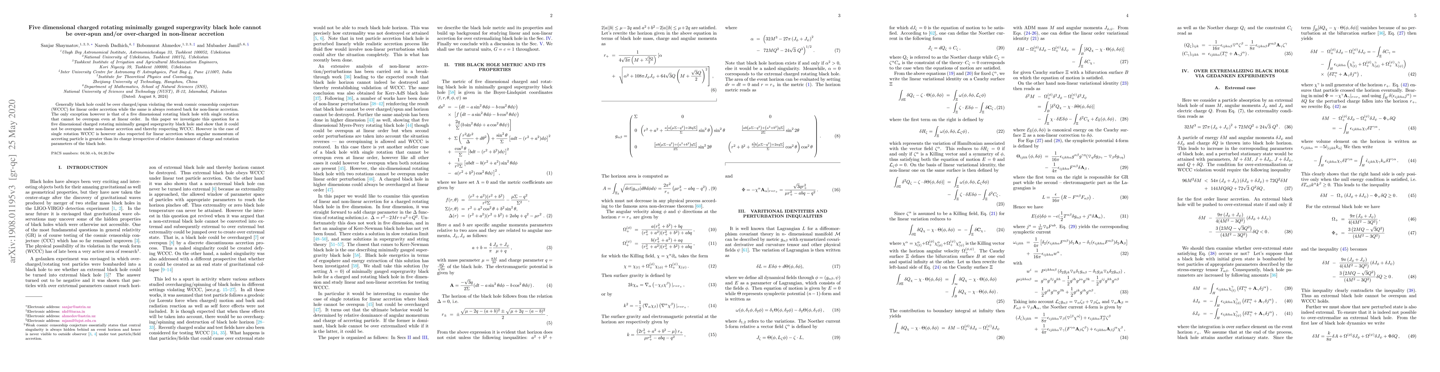 Generally black hole could be over charged/spun violating the weak cosmic censorship conjecture (WCCC) for linear order accretion while the same is always restored back for non-linear accretion. The only exception however is that of a five dimensional rotating black hole with single rotation that cannot be overspun even at linear order. In this paper we investigate this question for a five dimensional charged rotating minimally gauged supergravity black hole and show that it could not be overspun under non-linear accretion and thereby respecting WCCC. However in the case of single rotation WCCC is however also respected for linear accretion when angular momentum of accreting particle is greater than its charge irrespective of relative dominance of charge and rotation parameters of black hole.