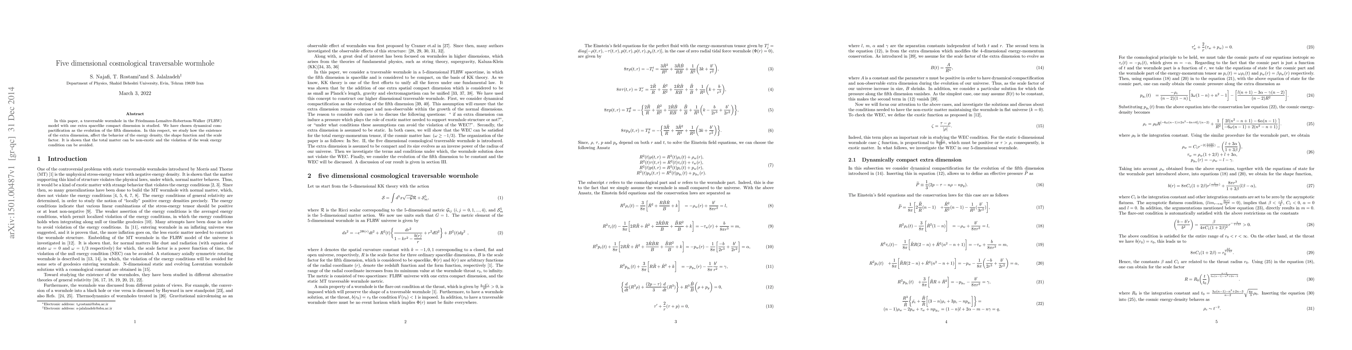 In this paper, a traversable wormhole in the Friedmann-Lema\^{\i}tre-Robertson-Walker (FLRW) model with one extra spacelike compact dimension is studied. We have chosen dynamical compactification as the evolution of the fifth dimension. In this respect, we study how the existence of the extra dimension, affect the behavior of the energy density, the shape function and the scale factor. It is shown that the total matter can be non-exotic and the violation of the weak energy condition can be avoided.
