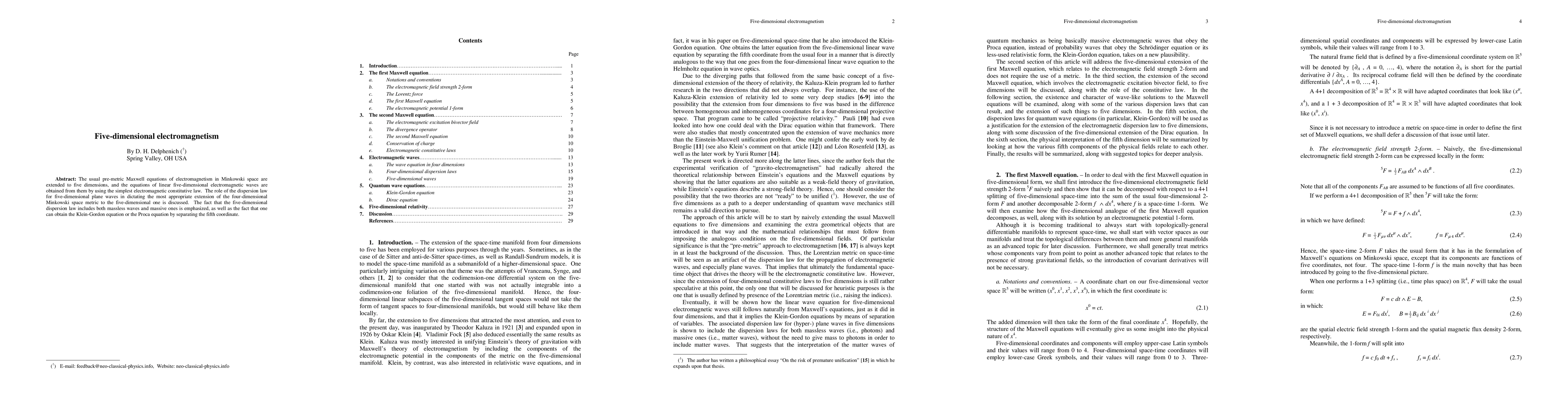 This paper extends Maxwell's equations of electromagnetism to five dimensions, deriving the equations for linear five-dimensional electromagnetic waves. It discusses how the five-dimensional dispersion law influences the metric extension and highlights the presence of both massless and massive waves, leading to the Klein-Gordon or Proca equations when considering the fifth coordinate.