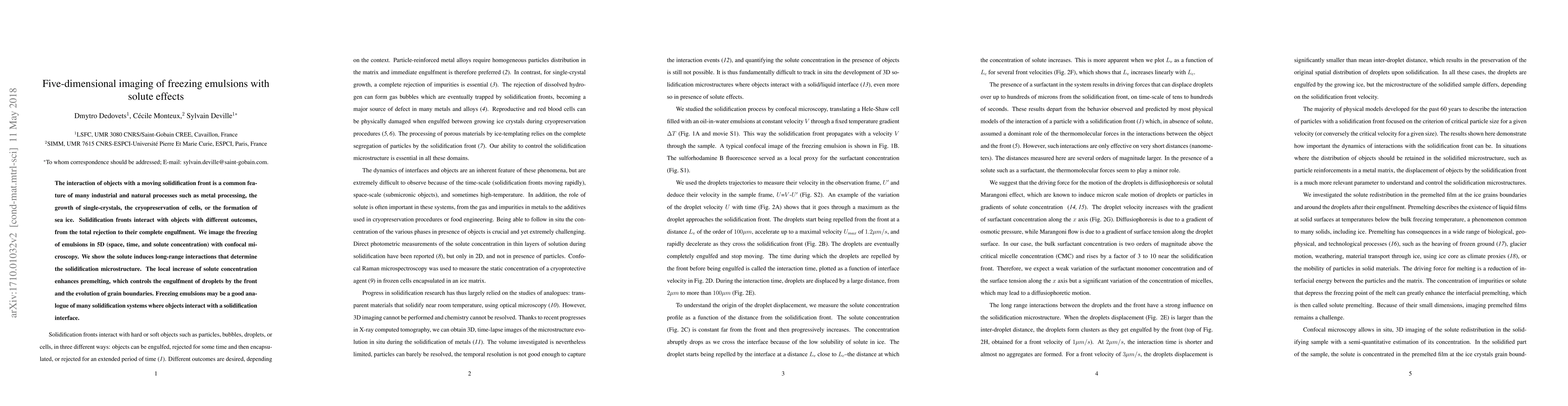 This paper utilizes 5D confocal microscopy to image the freezing of emulsions, revealing how solute concentration influences the solidification process and microstructure. The study demonstrates that solute-induced local concentration increases enhance premelting, thereby affecting droplet engulfment and grain boundary evolution.