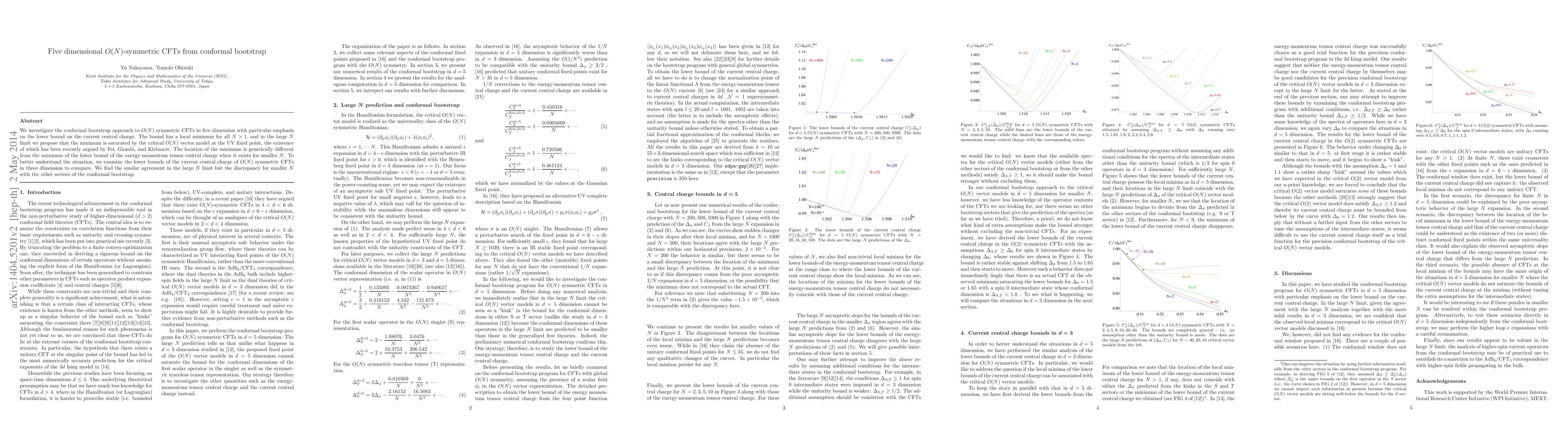 This paper uses conformal bootstrap to study $O(N)$ symmetric conformal field theories (CFTs) in five dimensions, focusing on the lower bound for the current central charge. It finds that the bound has a local minimum for all $N>1$ and proposes that this minimum is achieved by the critical $O(N)$ vector model in the large $N$ limit.