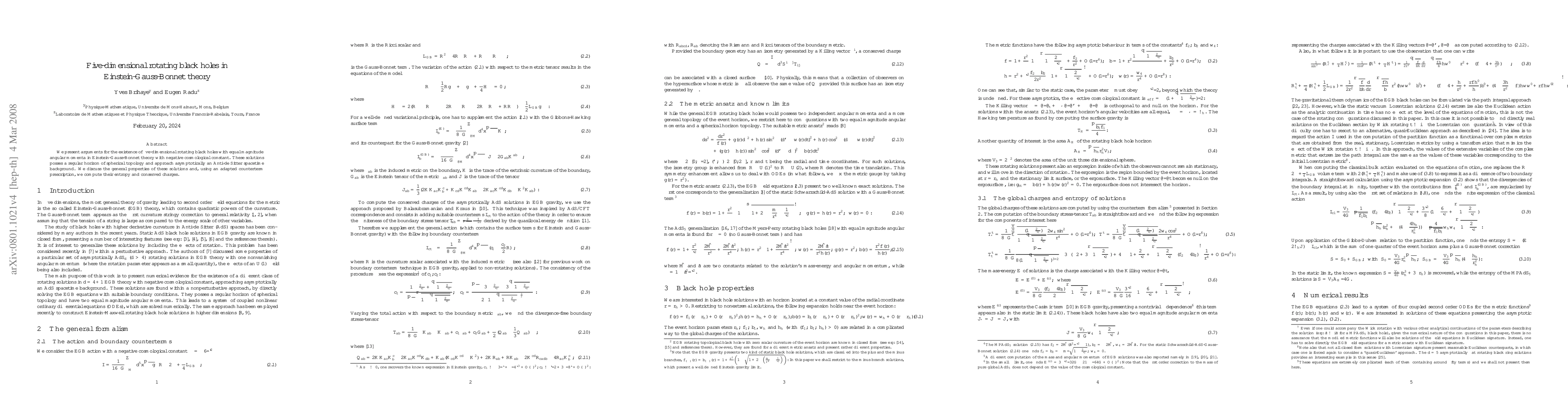 This paper explores five-dimensional rotating black holes in Einstein-Gauss-Bonnet theory with a negative cosmological constant, demonstrating the existence of regular horizons and calculating their entropy and conserved charges using an adapted counterterm prescription.