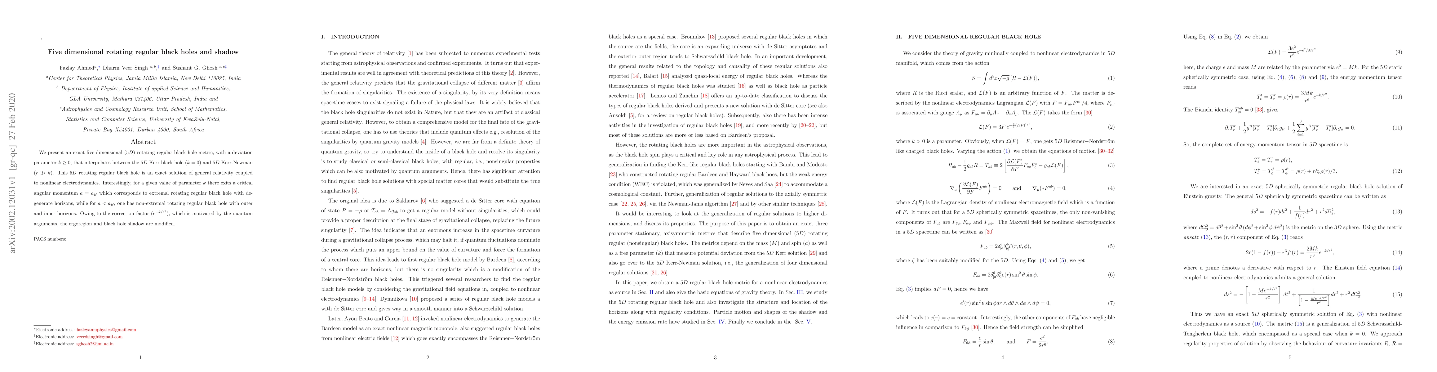 This paper introduces a five-dimensional rotating regular black hole metric, bridging the $5D$ Kerr and Kerr-Newman solutions, and analyzes its shadow and ergoregion modifications due to a correction factor $e^{-k/r^2}$. It identifies a critical angular momentum for extremal black holes with degenerate horizons.
