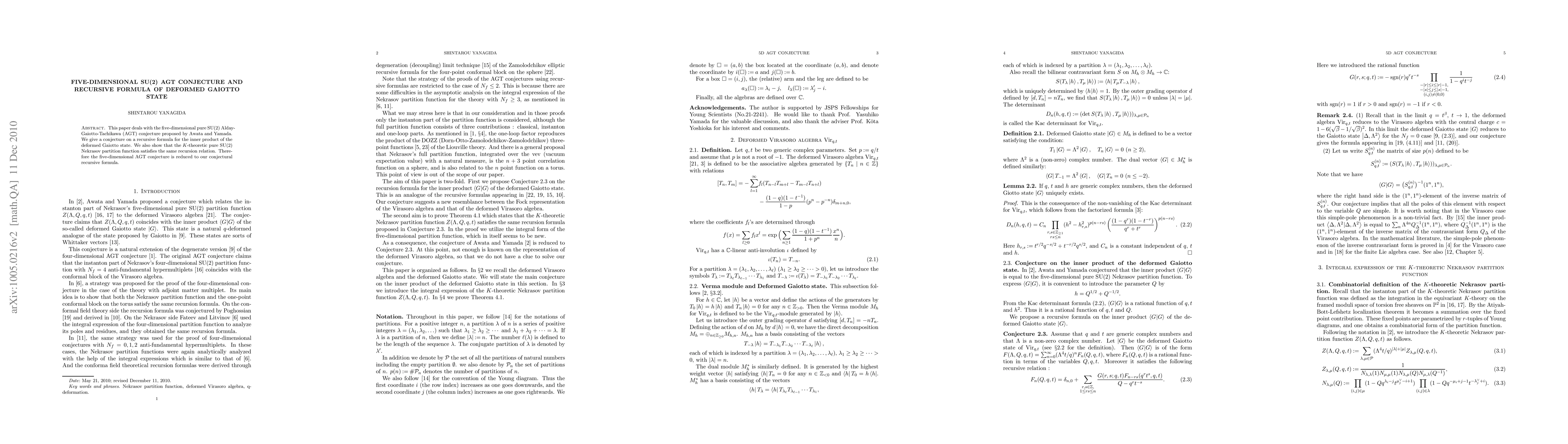 This note deals with the five-dimensional pure SU(2) AGT conjecture proposed by Awata and Yamada. We give a conjecture on a recursive formula for the inner product of the deformed Gaiotto state. We also show that the K-theoretic pure SU(2) Nekrasov partition function satisfies the same recursion relation. Therefore the five-dimensional AGT conjecture is reduced to our conjectural recursive formula.