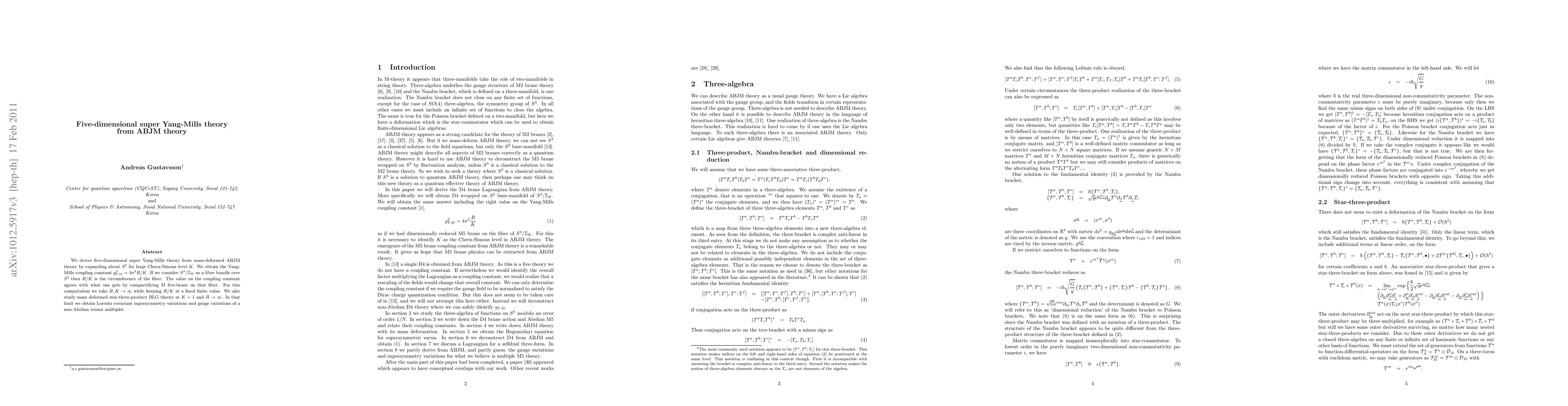 We derive five-dimensional super Yang-Mills theory from mass-deformed ABJM theory by expanding about $S^2$ for large Chern-Simons level $K$. We obtain the Yang-Mills coupling constant $g_{YM}^2 = 4\pi^2 R/K$. If we consider $S^3/{\mb{Z}_K}$ as a fiber bundle over $S^2$ then $R/K$ is the circumference of the fiber. The value on the coupling constant agrees with what one gets by compactifying M five-brane on that fiber. For this computation we take $R,K\to \infty$ while keeping $R/K$ at a fixed finite value. We also study mass deformed star-three-product BLG theory at K=1 and $R\to \infty$. In that limit we obtain Lorentz covariant supersymmetry variations and gauge variations of a non-Abelian tensor multiplet.