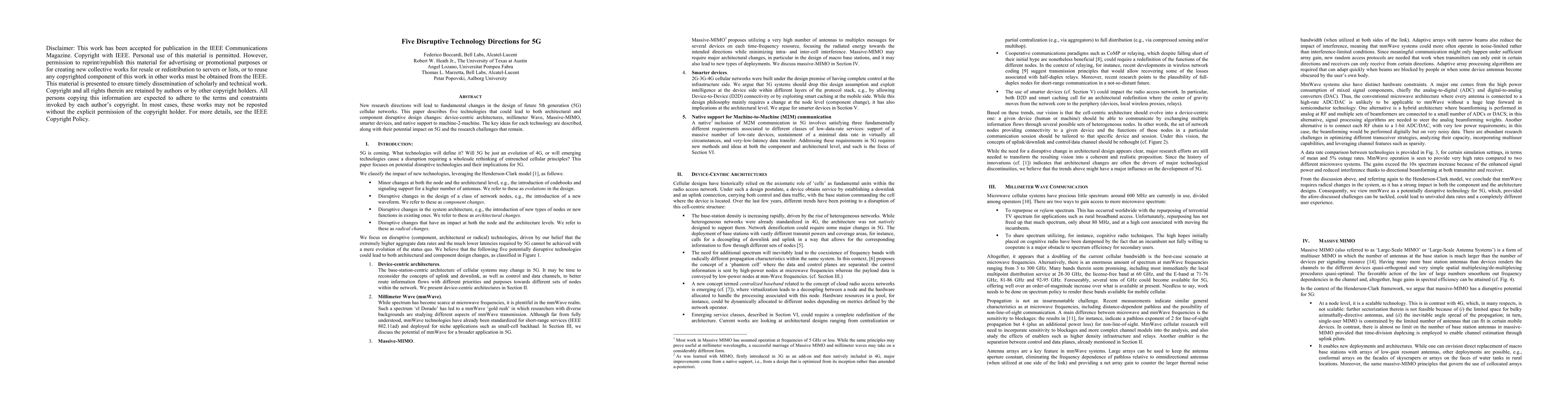 This paper explores five disruptive technologies—device-centric architectures, millimeter Wave, Massive-MIMO, smarter devices, and native machine-2-machine support—that could fundamentally reshape 5G cellular networks, detailing their potential impacts and the research challenges ahead.