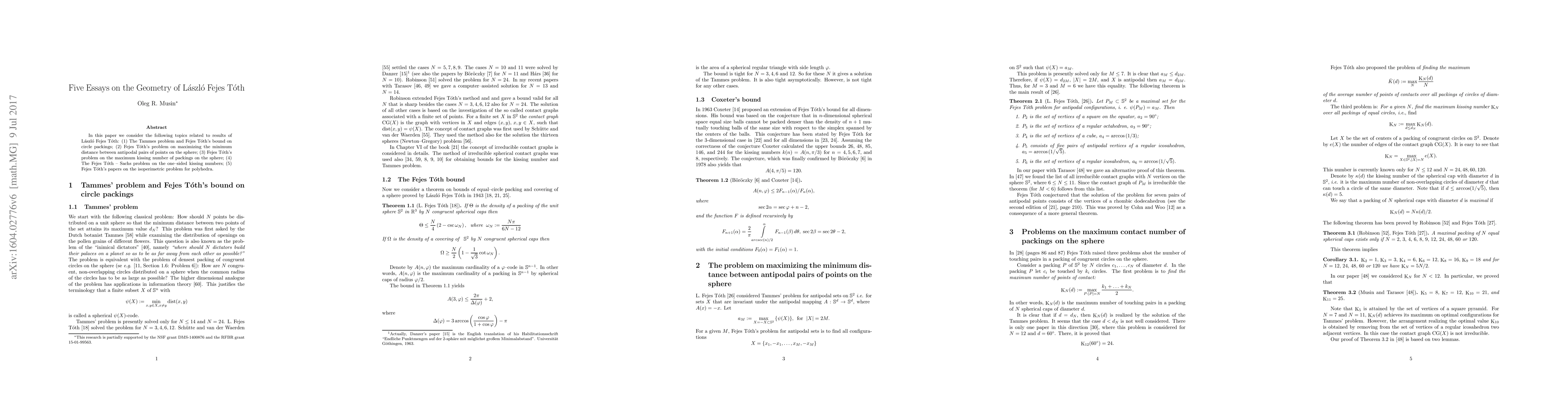 This paper explores several geometric problems initiated by László Fejes Tóth, including circle packing bounds, maximizing minimum distances on the sphere, kissing numbers, and the isoperimetric problem for polyhedra. It delves into Fejes Tóth's contributions to these topics and their mathematical implications.