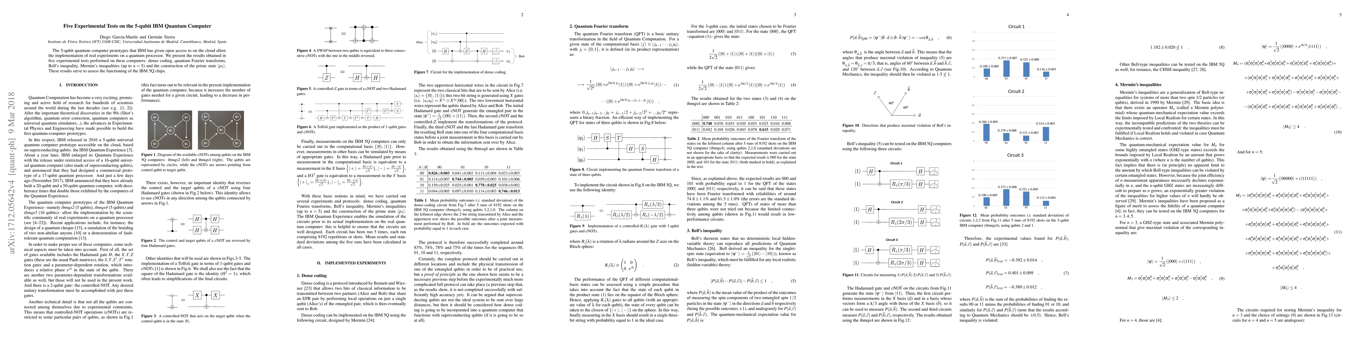 The paper details five experimental tests on IBM's 5-qubit quantum computer prototypes, assessing their functionality through dense coding, quantum Fourier transforms, and tests of Bell's and Mermin's inequalities, along with the construction of the prime state $|p_3\rangle$. The results provide insights into the performance of IBM's 5Q chips.