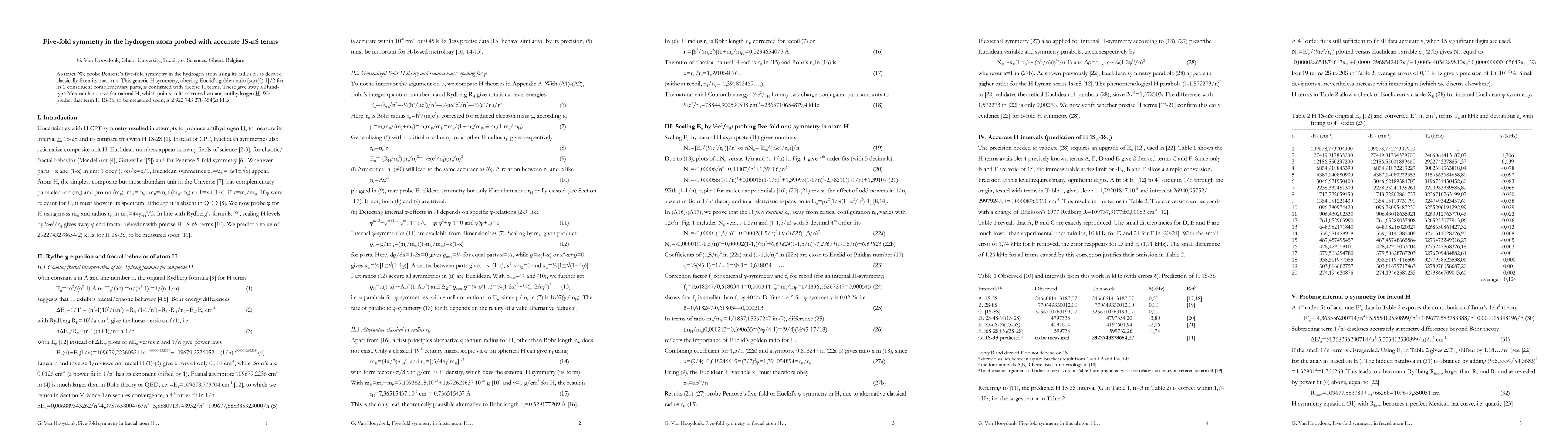 We probe Penrose's five-fold symmetry and fractal behavior for atom H. With radius r(H) derived from H mass m(H), H symmetry is governed by Euclid's golden ratio phi=0,5(sqrt(5)-1), as proved with accurate H terms. A Hund-type Mexican hat curve in the natural H spectrum points to mirrored antihydrogen Hbar. We predict that term H 1S-3S, to be measured soon, is 2 922 743 278 654 kHz.