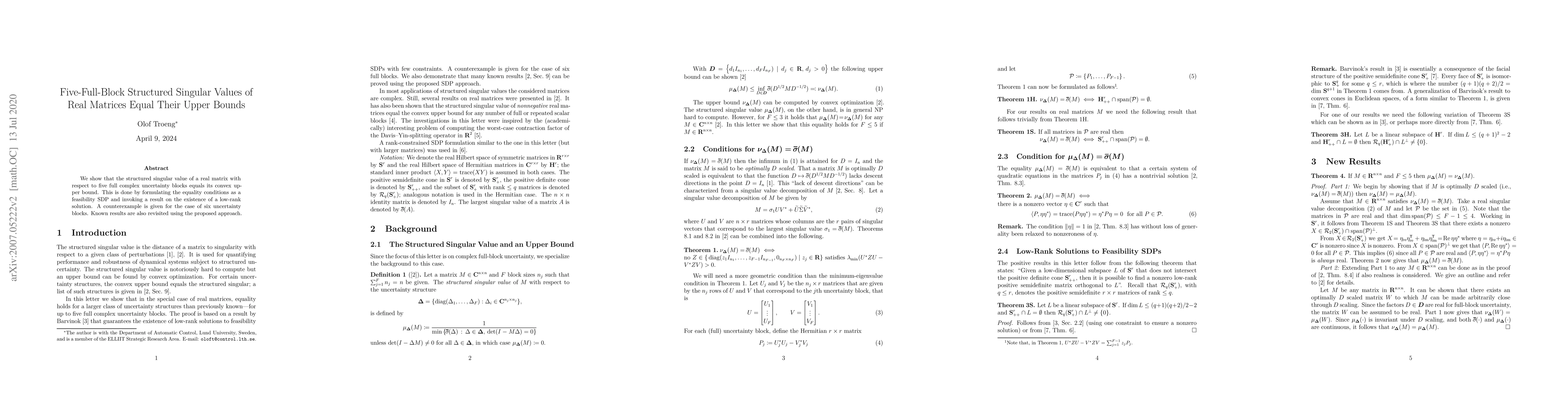 A new study finds that for real matrices with five full complex uncertainty blocks, their structured singular value equals its convex upper bound. This breakthrough has implications for control system design and robustness analysis.